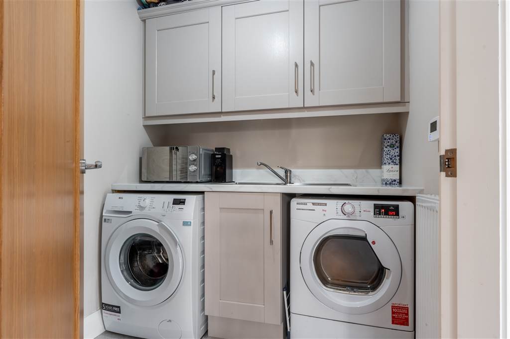 With a range of eye and low-level fitted units, stainless-steel sink unit and drainer. Plumbed for washing machine. Space for tumble dryer. Tiled flooring.