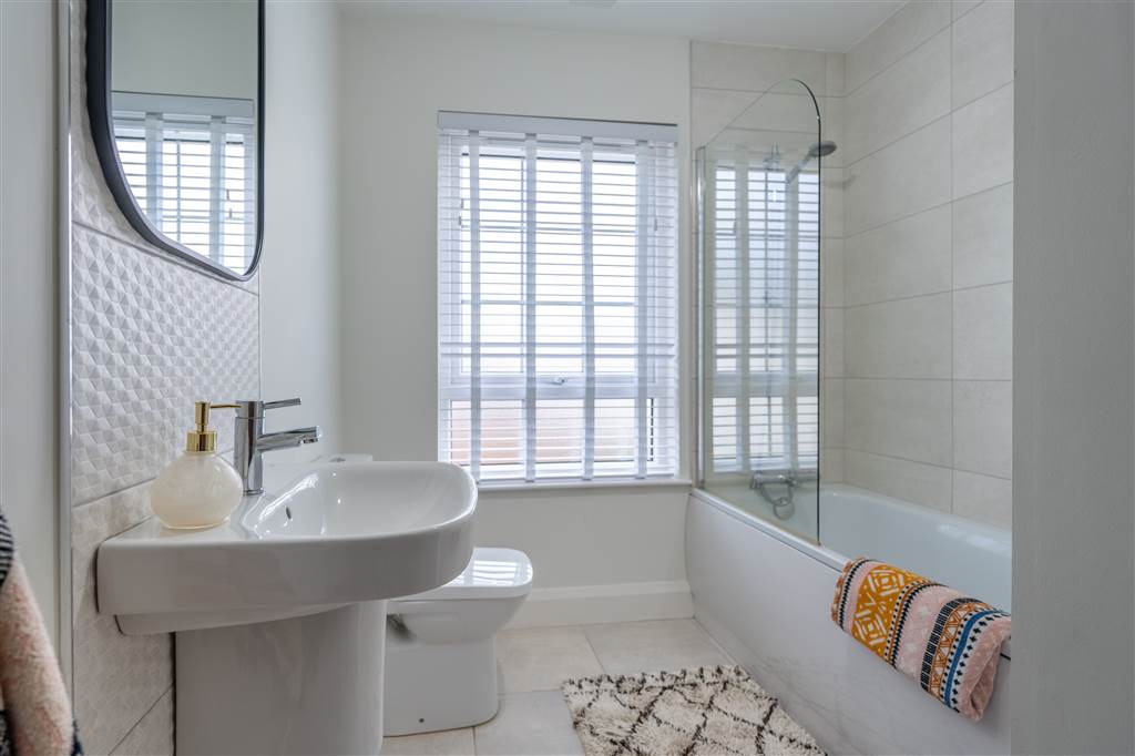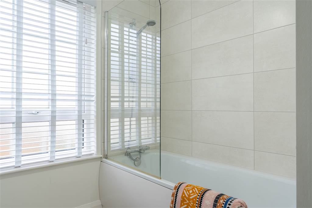 With 3-piece white suite comprising LFWC, WHB and panelled bath with shower over. Splash back tiling. Tiled flooring.
