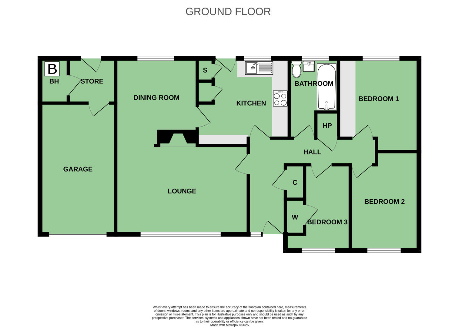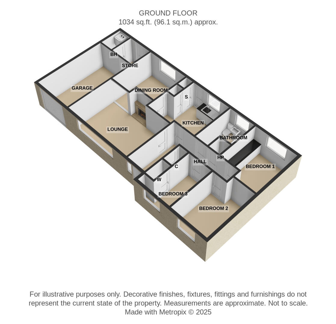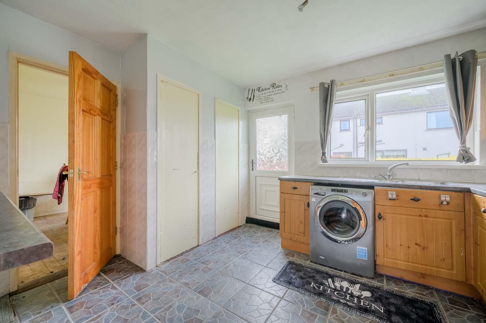 Inside, the layout is well-proportioned, featuring a bright lounge with a large picture window and a traditional fireplace, a practical kitchen with ample storage, and a family bathroom with white suite. The bedrooms offer flexibility for family living or creating a home office.