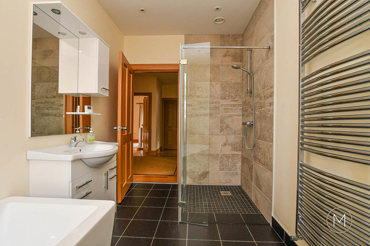 Built with 200mm cavity wall insulation, triple-glazed windows, and a Titon heat recovery system, this home achieves an impressive level of energy efficiency. The thermal store system provides 24/7 hot water, while underfloor heating throughout ensures a comfortable environment in every season. A Beam central vacuum system simplifies maintenance, and a fully floored attic with pull-down ladder offers excellent storage space.