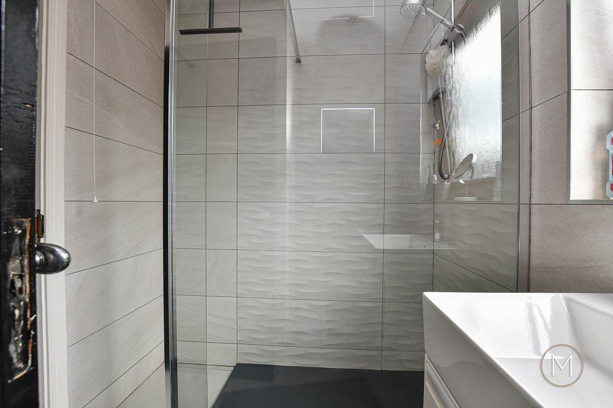 Modern white suite comprising of a tiled shower enclosure with maisn powered shower; low flush W.C; wash hand basin with vanity unit; tiled floor and walls