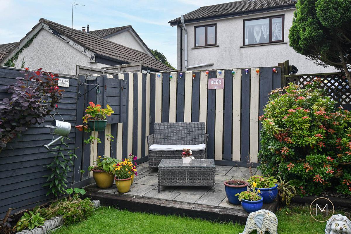 Private and enclosed rear garden with lawn and paved patio area; PVC oil tank; housed boiler; outside water tap