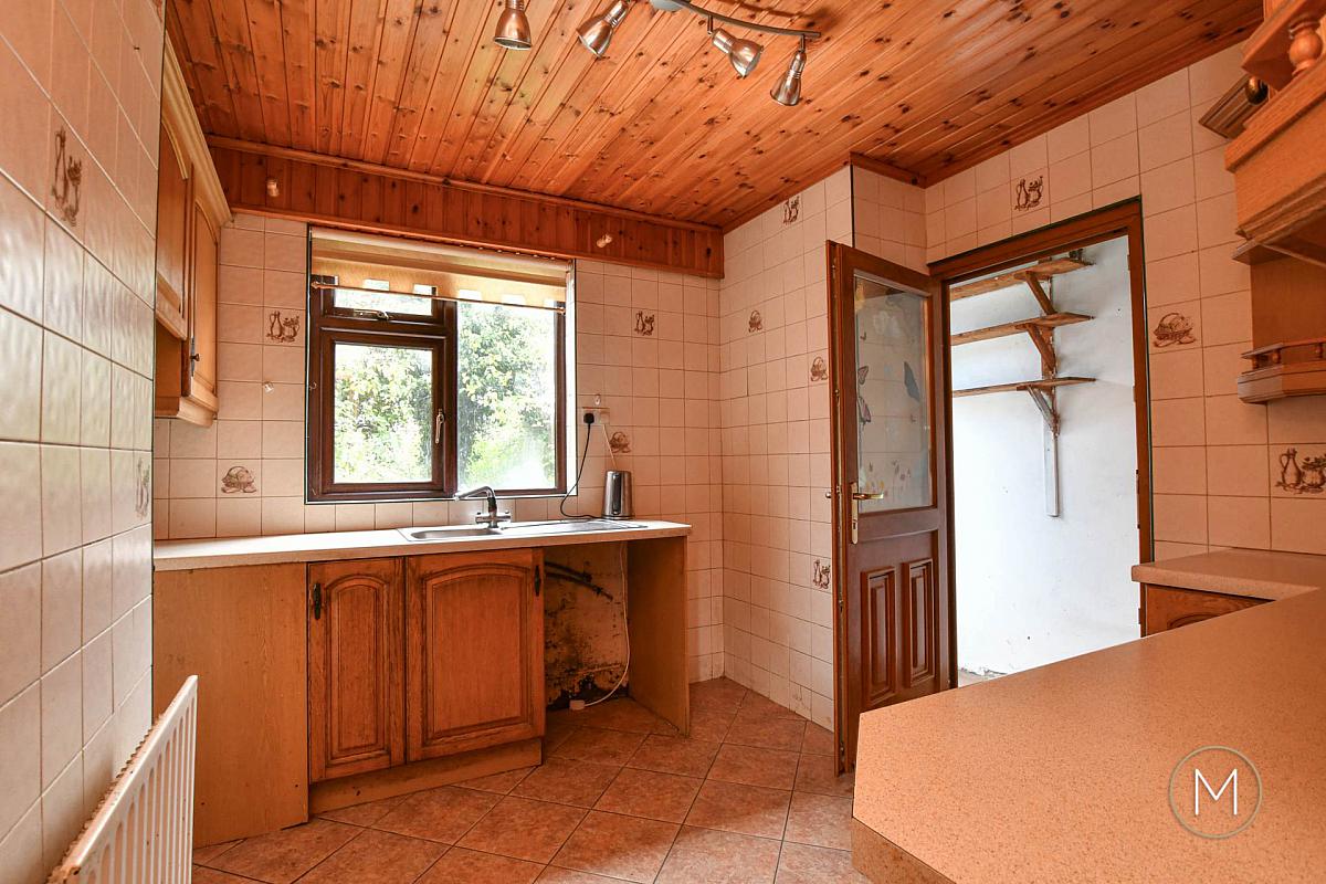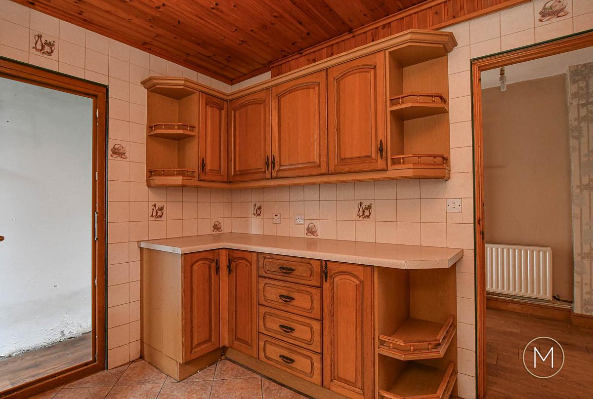 Fitted kitchen with a range of high and low level units; single stainless steel sink unit; tiled floor and walls; plumbed for washing machine; pine panelled ceiling; Formica style work surfaces