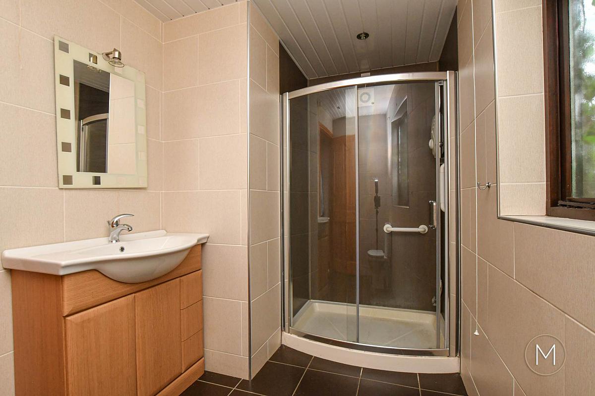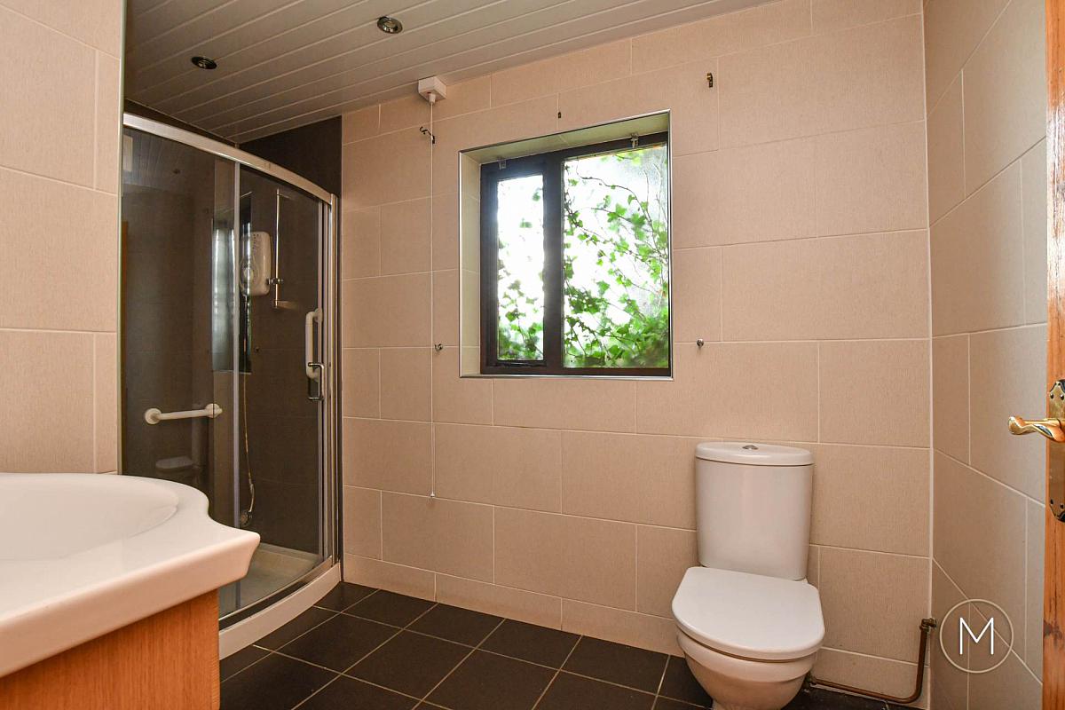 Modern white suite comprising of a tiled shower cubicle with electric shower; low flush W.C; wash hand basin with vanity unit; tiled floor and walls; spotlighting