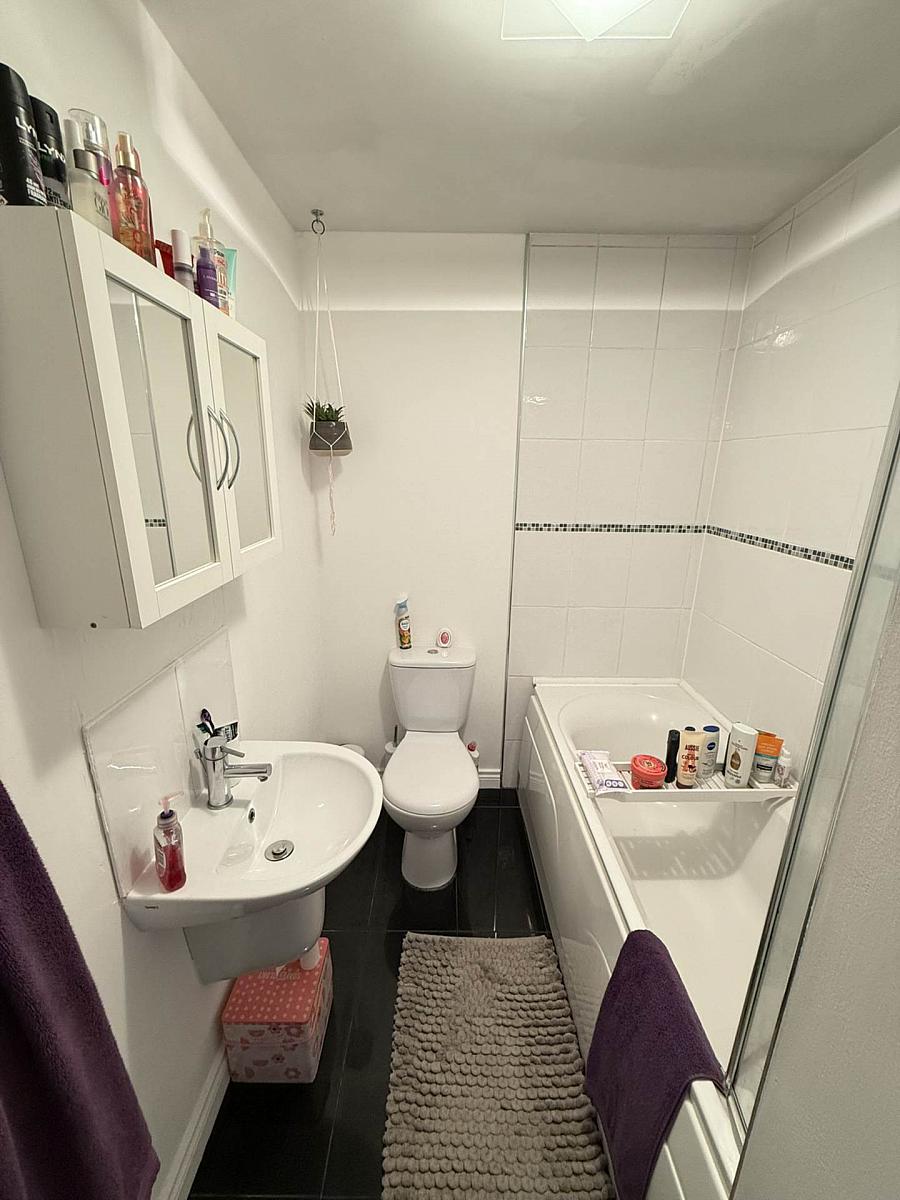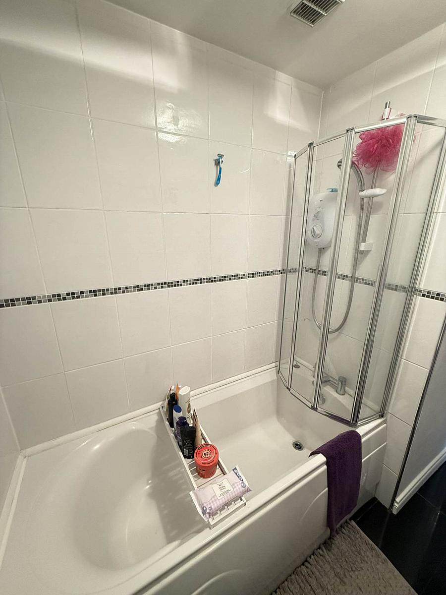Luxury fitted white suite comprising of panelled bath with shower screen and overhead electric shower; low flush W.C; wash hand basin; tiled floor; partially tiled walls