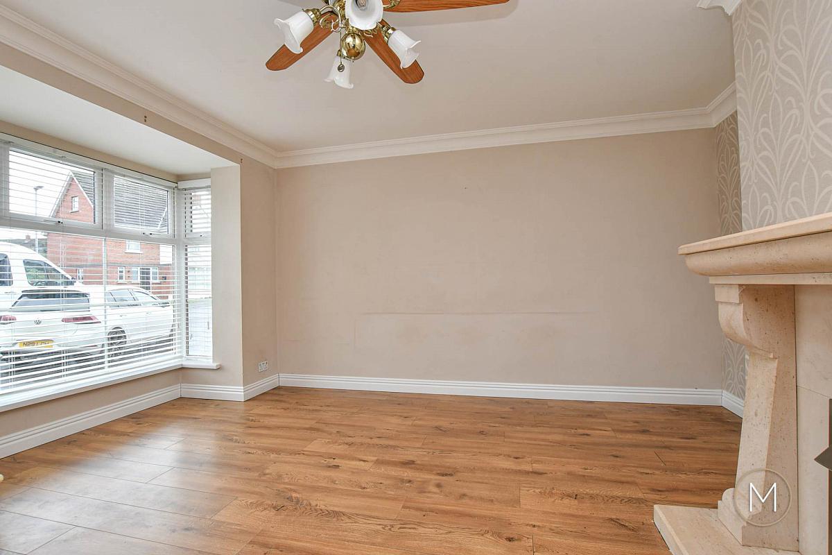 Feature fireplace with electric insert; wood laminate flooring; bay window