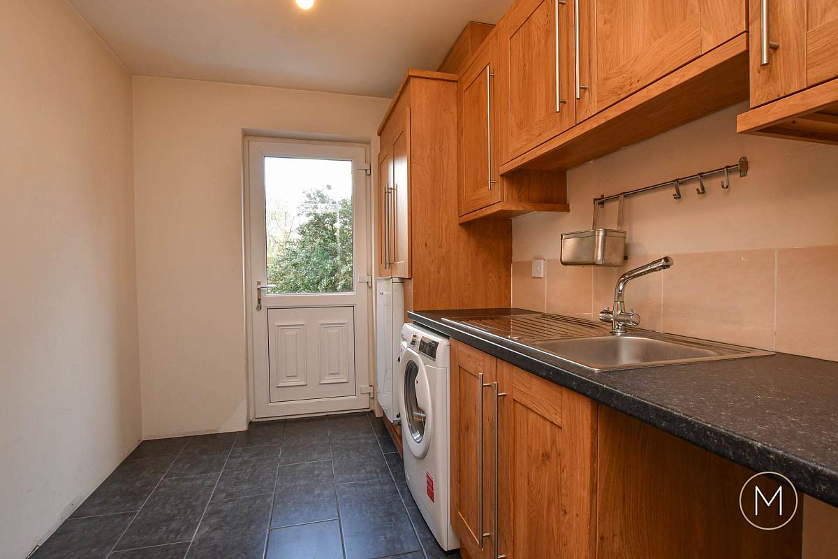 Fitted with a range of high and low level units; single drainer stainless steel sink unit; plumbed for washing machine; Formica work surfaces; space for dryer; oil boiler; tiled floor; glass panelled PVC door to rear
