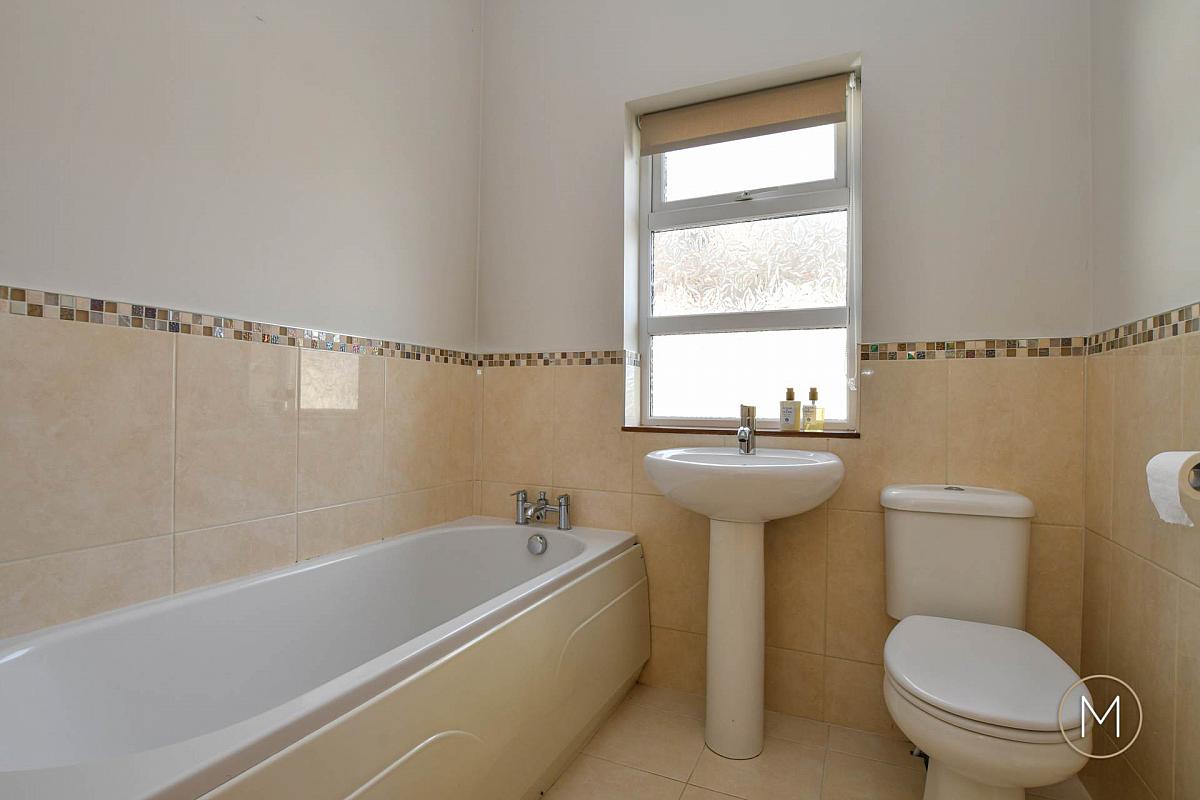 Contemporary white suite comprising of panelled bath with chrome mixer taps; low flush W.C; wash hand basin; tiled floor; partially tiled walls