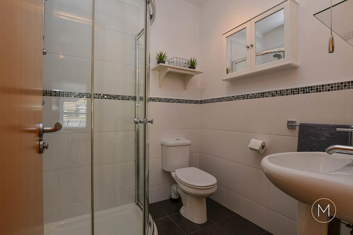 Attractive white suite comprising of quadrant style tiled shower cubicle; low flush W.C; wash hand basin; tiled flooring; partially tiled walls; extractor fan