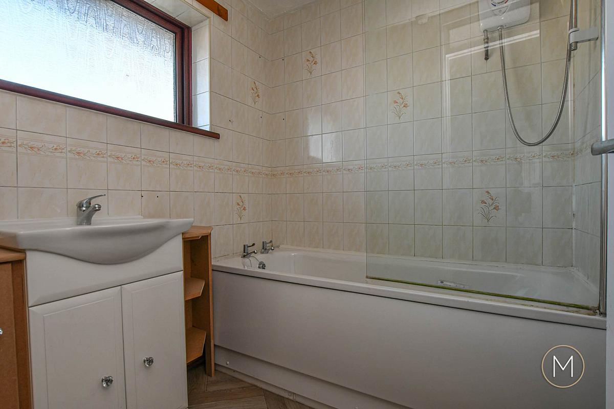 White suite comprising of panelled bath with chrome taps, electric shower overhead and glass shower screen; wash hand basin with vanity unit; tiled walls