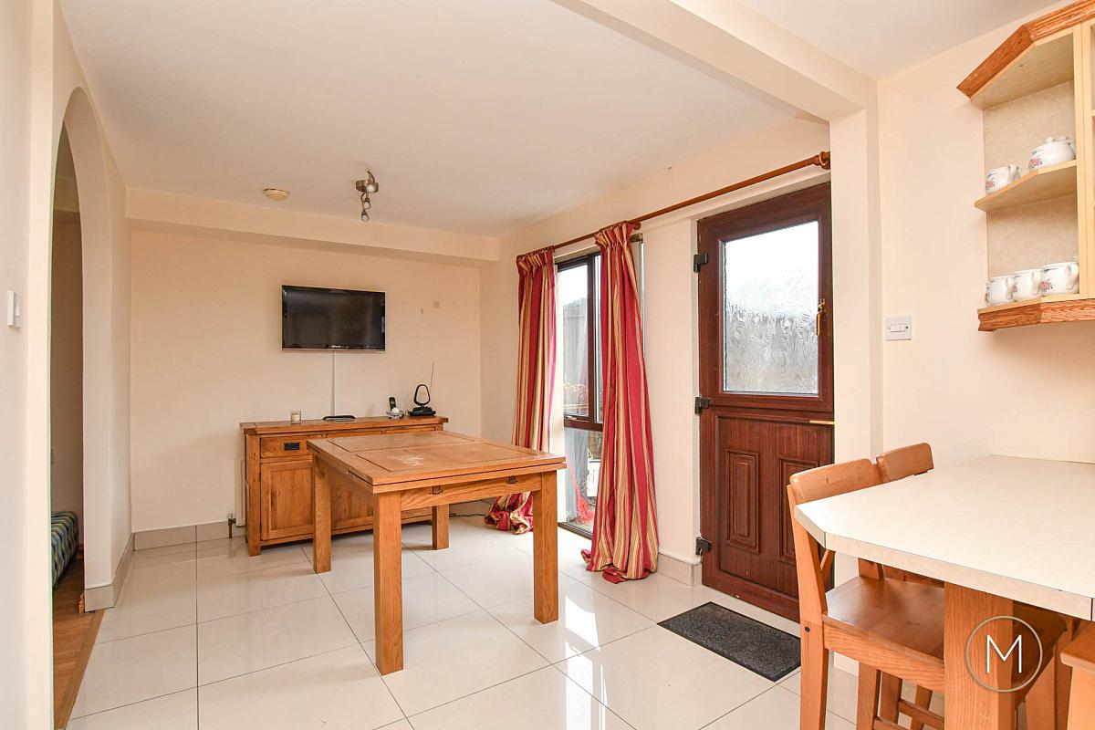 The property offers generous accommodation both internally and externally. On entering, you are welcomed by a spacious entrance hall finished with attractive wood flooring, setting the tone for the rest of the home. The cosy living room features a fireplace with fire, creating a warm and inviting focal point and benefits from an open archway leading through to the dining room. The dining area is finished with tiled flooring and flows seamlessly into the open-plan fitted kitchen, which offers a wide range of units and excellent storage, complemented further by a separate storage cupboard.