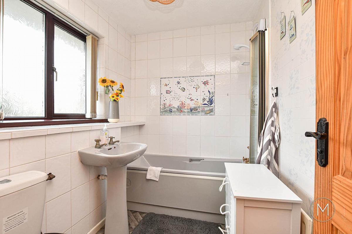 On the first floor, the property boasts three well-proportioned bedrooms, two of which benefit from built-in storage, along with a coloured bathroom suite. Additional features include oil-fired central heating and double-glazed windows throughout, ensuring comfort and efficiency all year round.