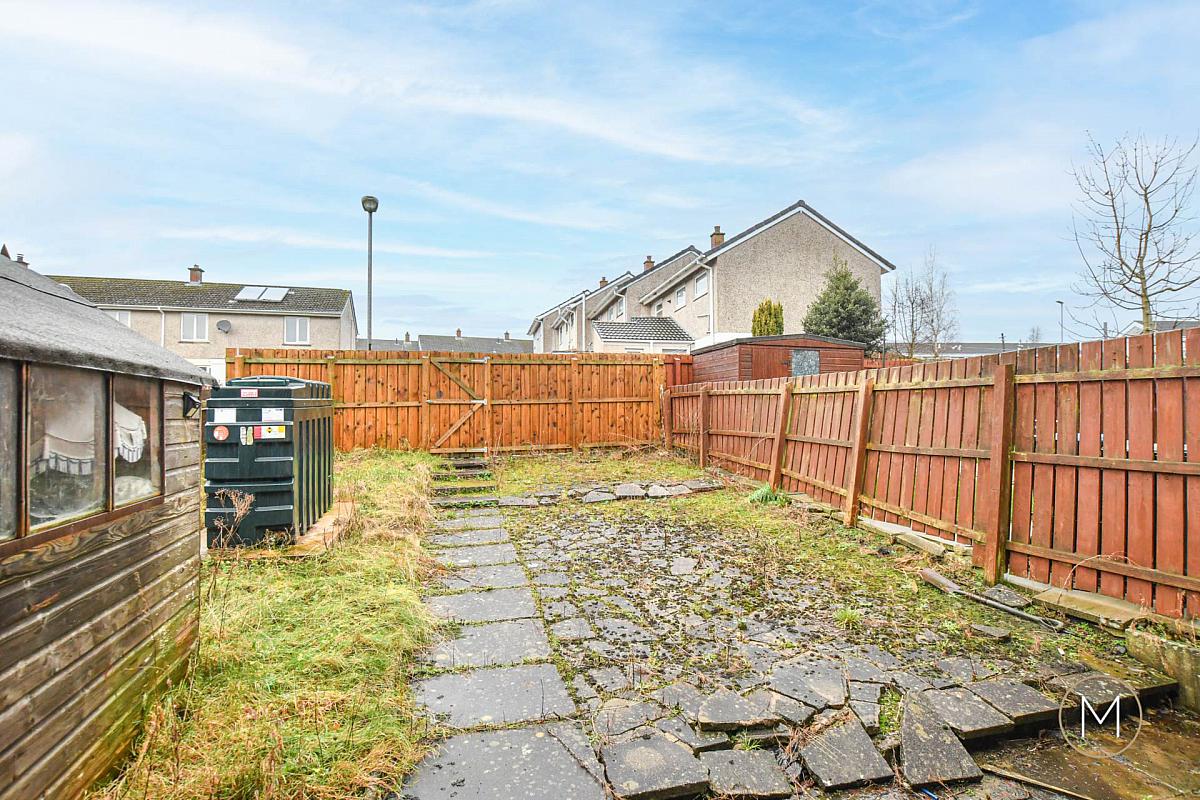 Private and enclosed rear garden with lawn area and patio; PVC oil tank; housed boiler; outside water tap; exterior lighting