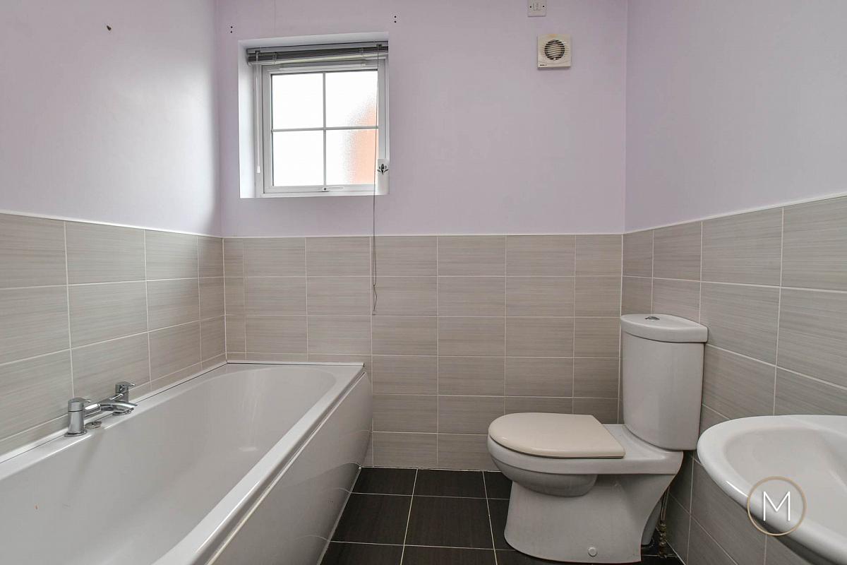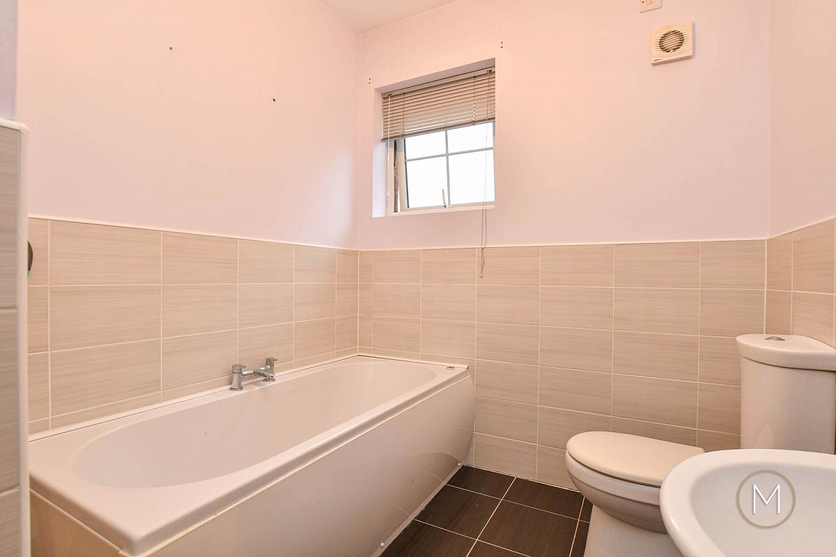Contemporary fitted white suite comprising of panelled bath with chrome mixer taps; low flush W.C; wash hand basin; partially tiled walls; tiled floor; extractor fan; tiled shower cubicle with electric shower