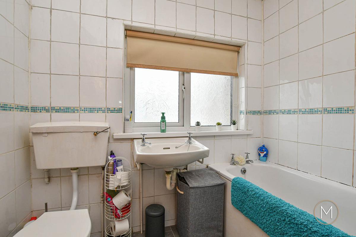 The fitted kitchen provides ample storage and workspace, with access to a separate rear hallway for added convenience. Upstairs, the property boasts two well-proportioned bedrooms, each offering comfortable accommodation with space for storage. A white bathroom suite completes the first floor, providing a clean and functional space.