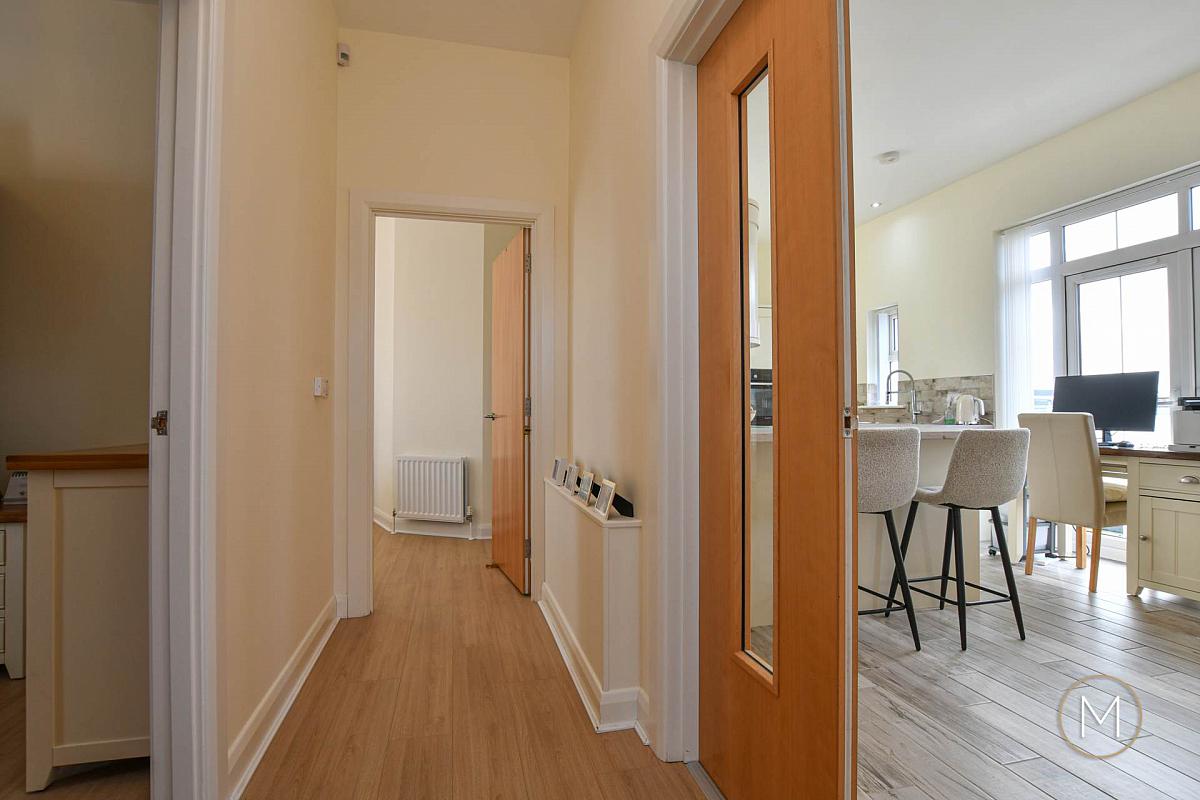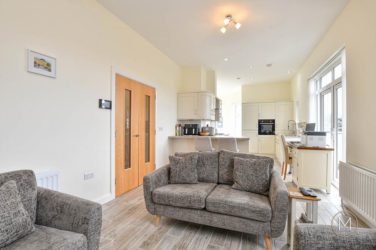 Accessed via a tiled entrance, a private staircase enhanced with recently fitted carpet leads to the main hallway, where a stunning wood laminate floor creates an immediate sense of warmth and style. From here, glazed double doors open into a bright and spacious open plan living area, thoughtfully designed to combine relaxation, dining, and cooking in one impressive space.