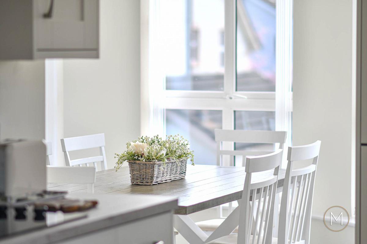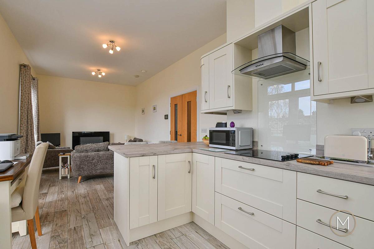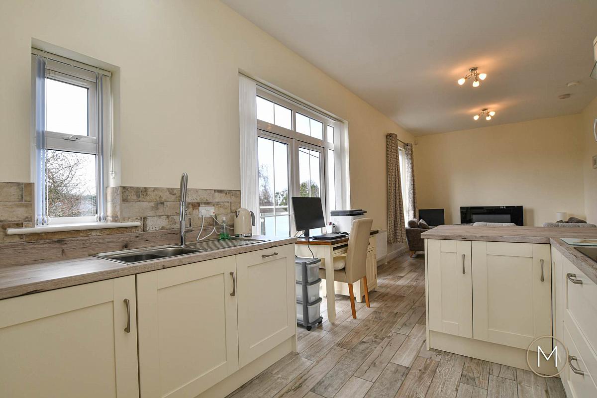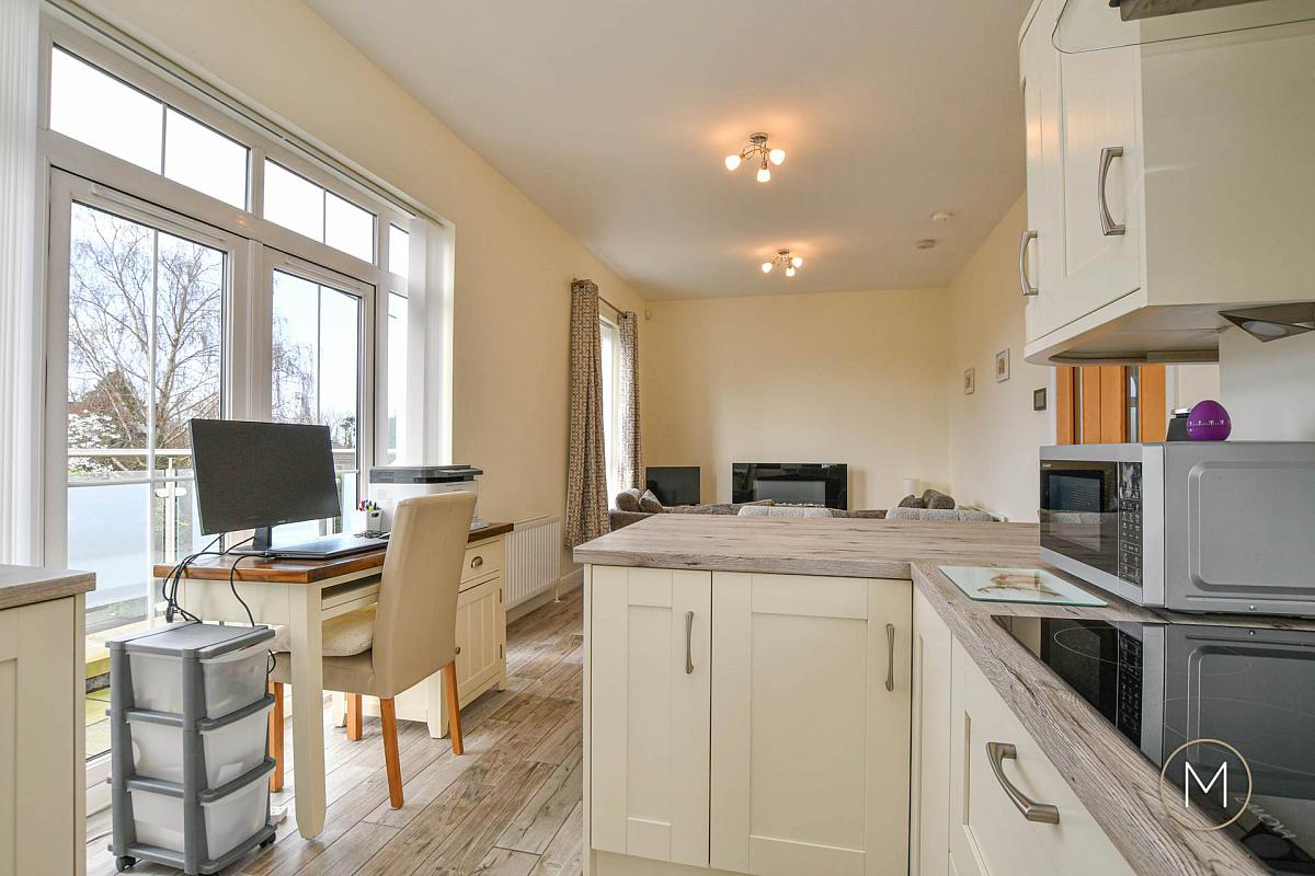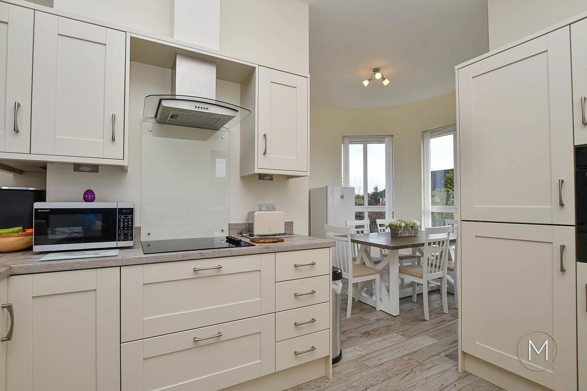 The living room benefits from contemporary LED spotlighting and flows seamlessly into the modern kitchen and dining area. The kitchen itself has been tastefully upgraded with solid wood ivory doors, complemented by contrasting work surfaces and integrated appliances for a sleek, streamlined finish. A dedicated dining area provides the perfect setting for entertaining, while a breakfast bar offers more informal seating. Double doors lead out to a private balcony with a stylish glass balustrade ideal for enjoying morning coffee or evening relaxation.