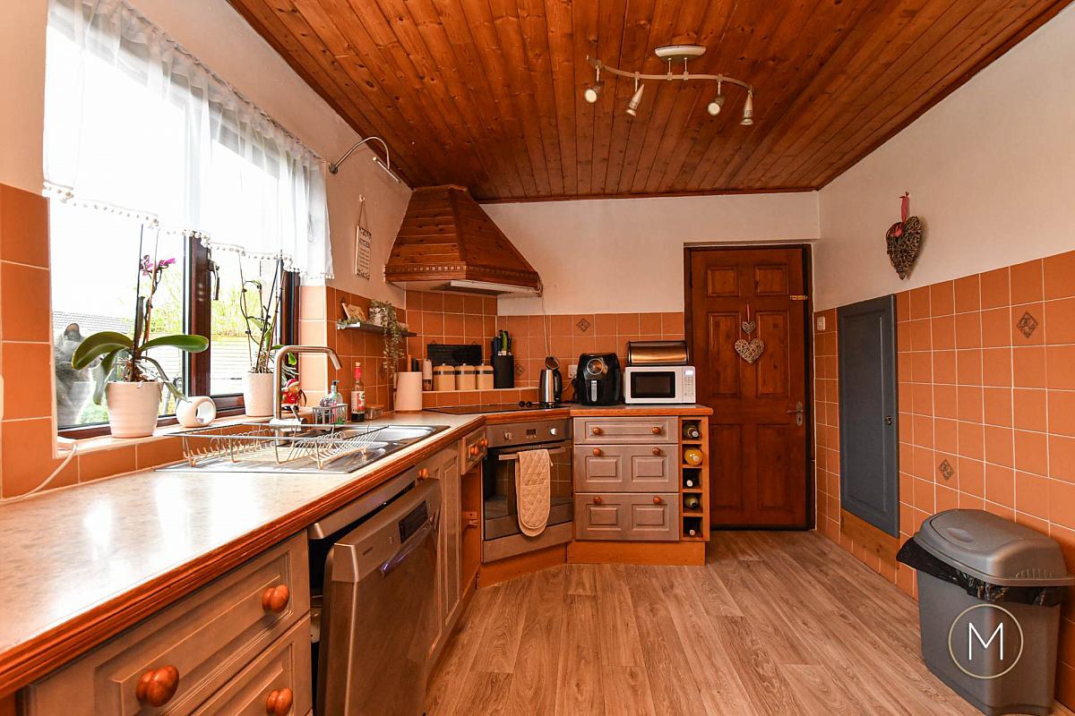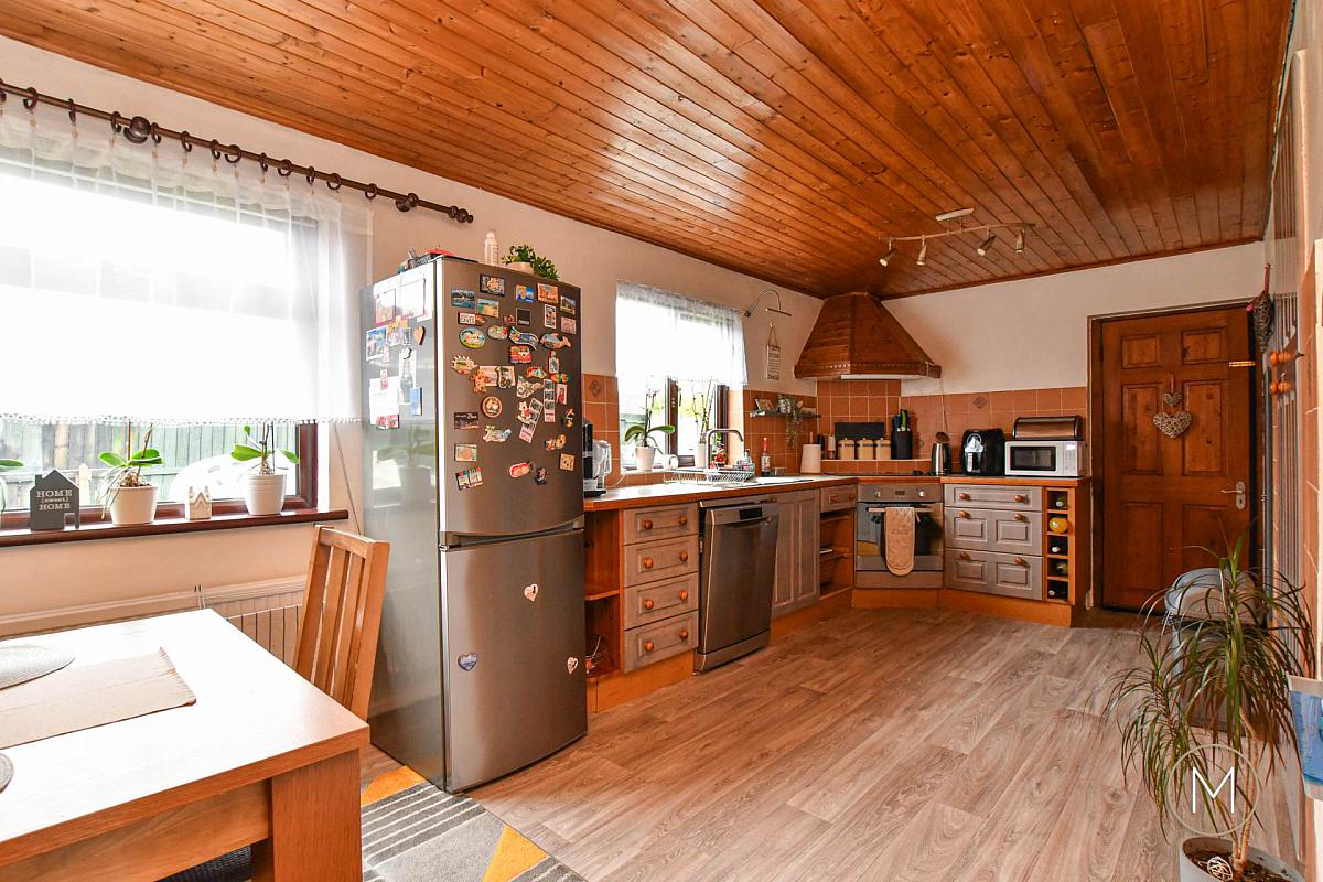 Fully fitted kitchen comprising a good range of high and low level units; integrated cooker, ceramic hob and extractor fan; plumbed for dishwasher; wine racking; 1 ½ bowl stainless steel unit; tiled splashback; laminated work surfaces; pine panelled ceiling