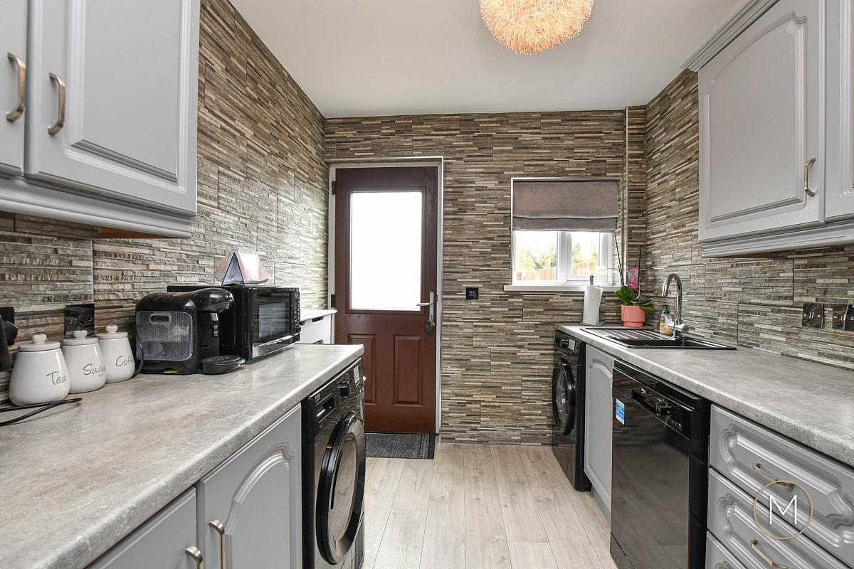 Fully fitted kitchen comprising of an excellent range of high and low level units; space for cooker; stainless steel extractor fan; plumbed for washing machine and dishwasher; Black ceramic sink unit; space for dryer; Formica style work surfaces; PVC glass panelled door to rear garden; wood laminate flooring