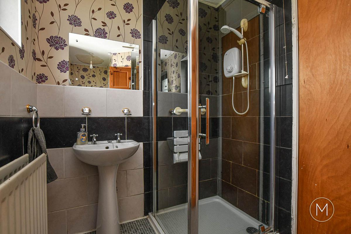White suite comprising of low flush W.C; wash hand basin; tiled shower cubicle with electric shower; tiled floor; partially tiled walls