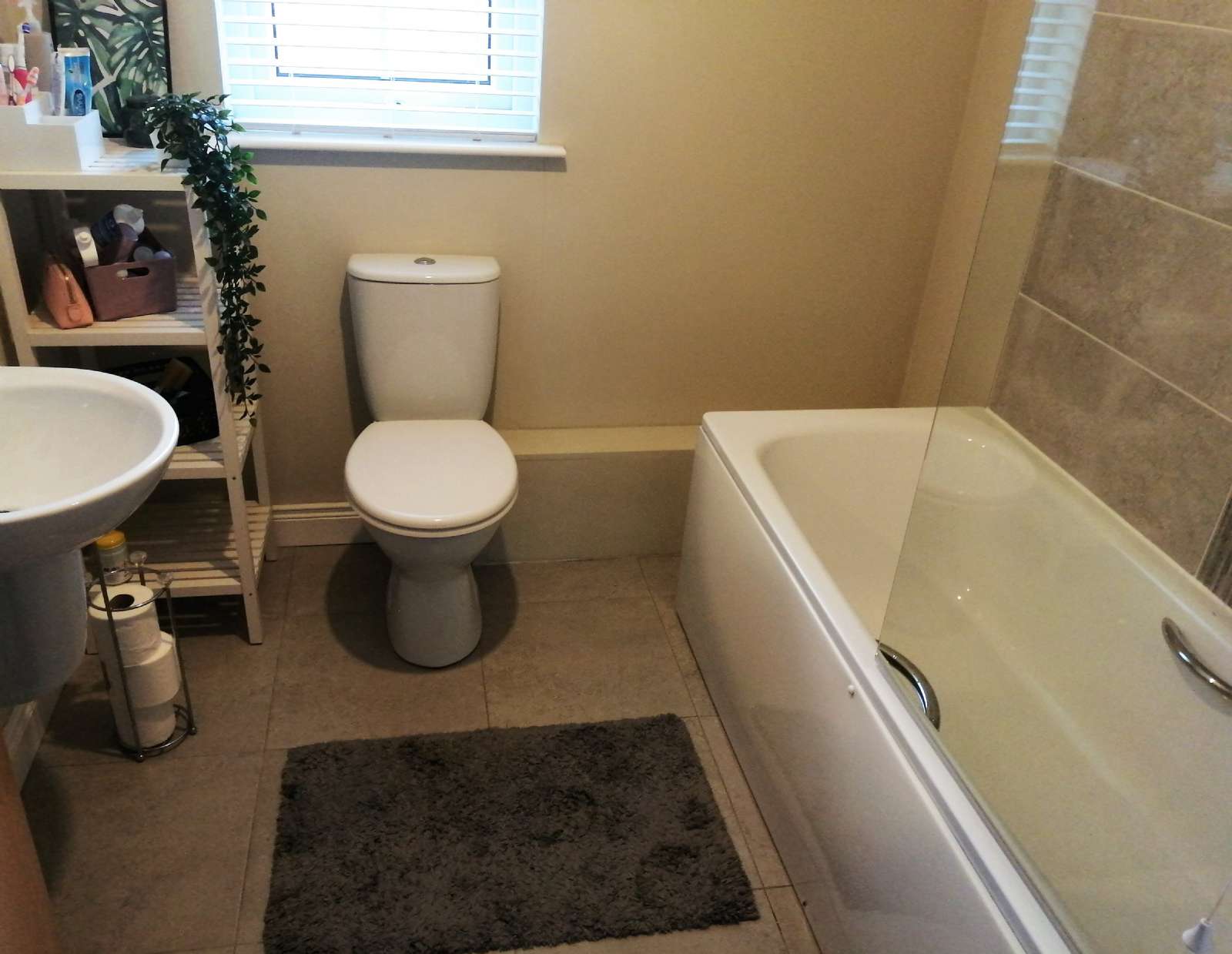 White bathroom suite with over bath shower