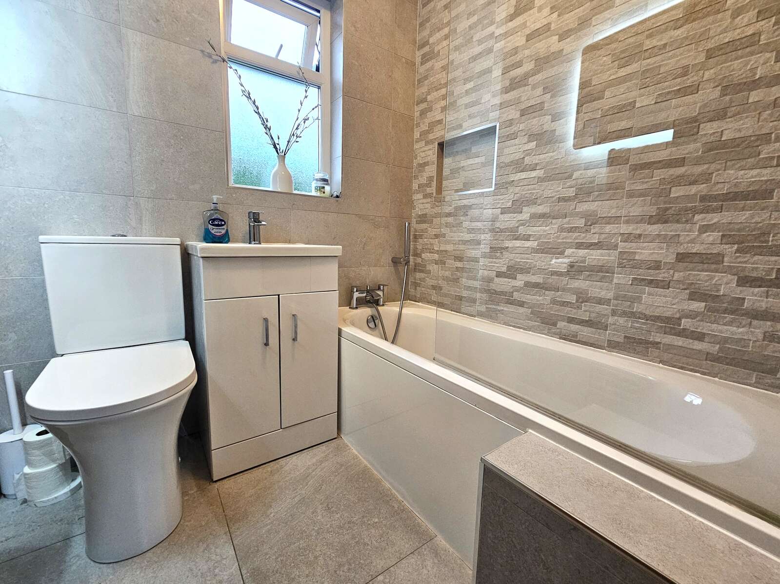New fully tiled bathroom consisting of, white w.c., white wash hand basin with high gloss vanity unit, bath with electric shower over