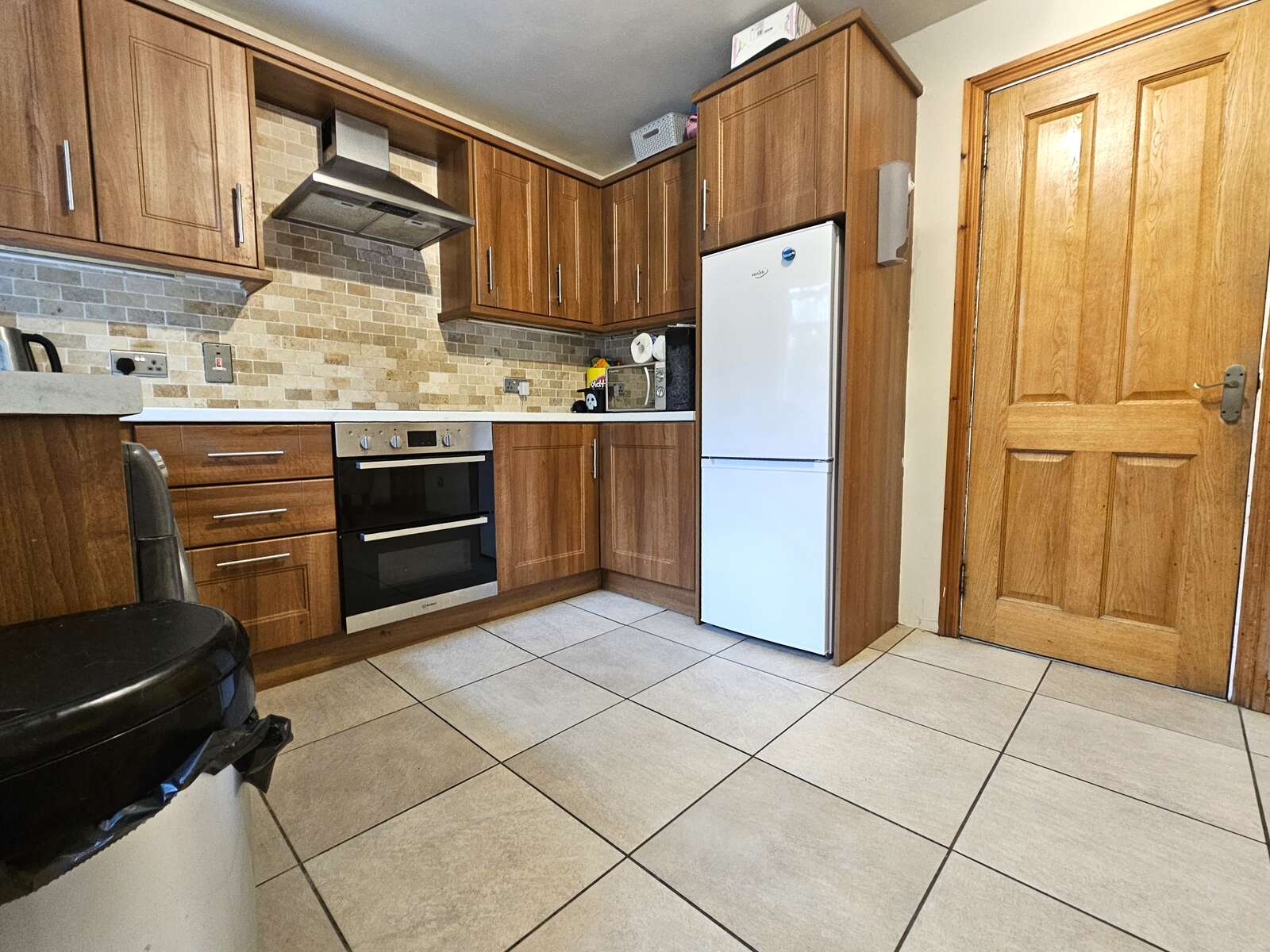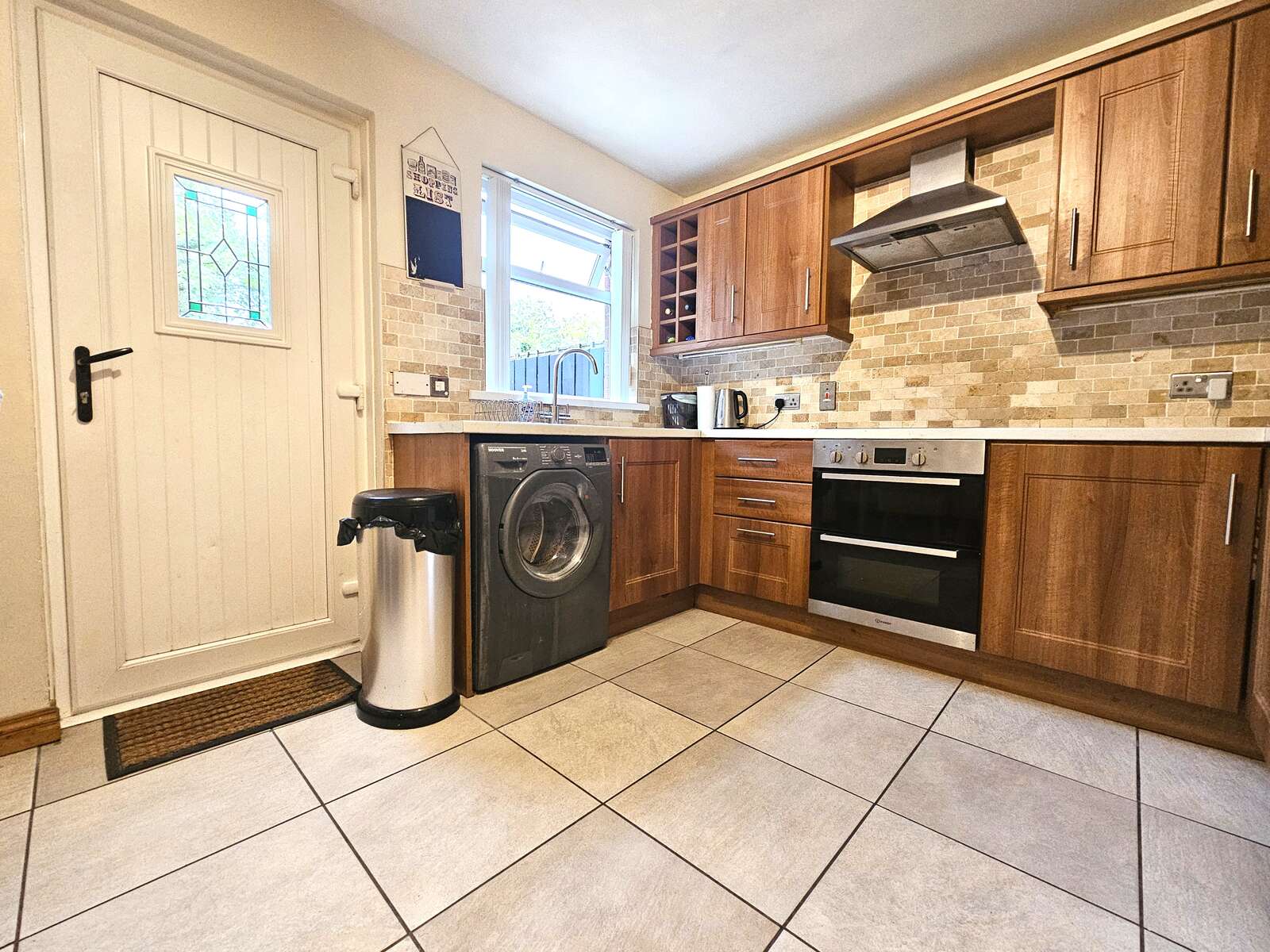 Walnut effect kitchen with integrated hob & oven with informal dining