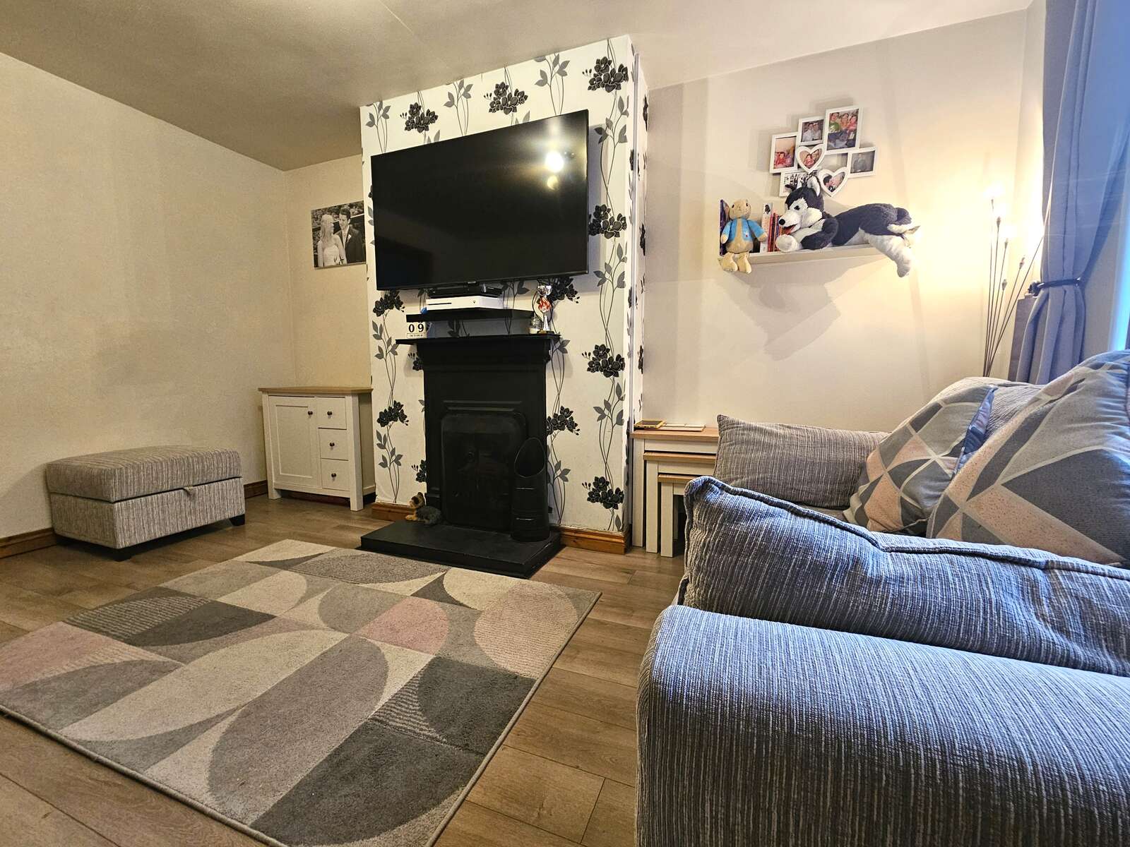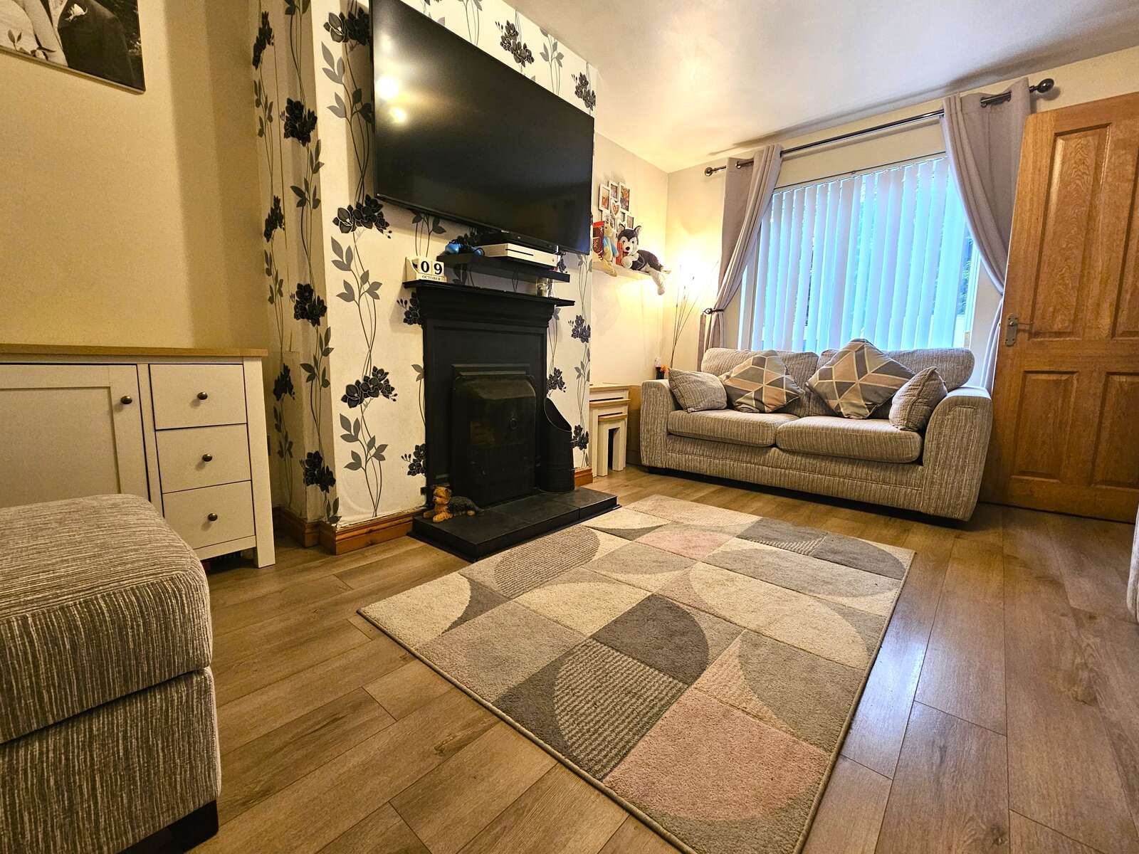 Lounge with wood effect laminate floor and feature fire surround with open fire facility