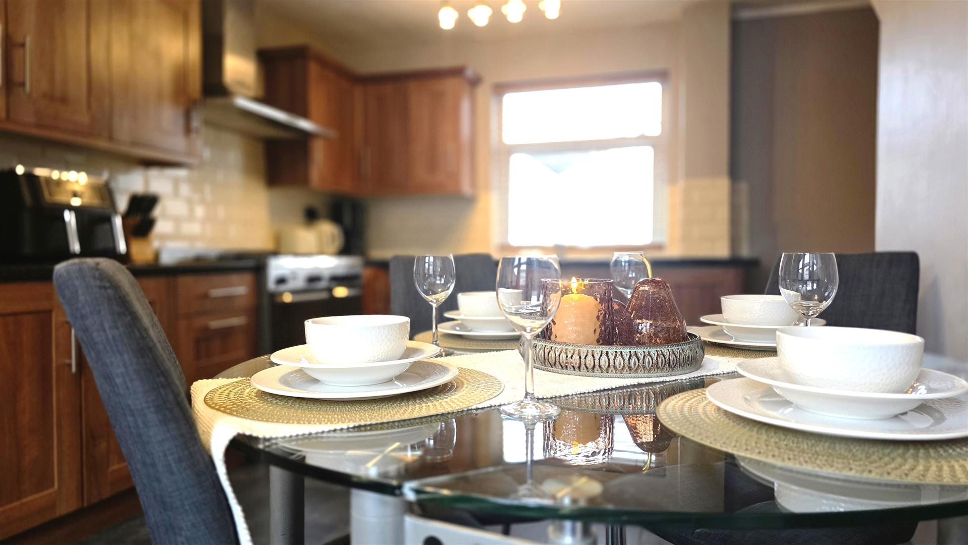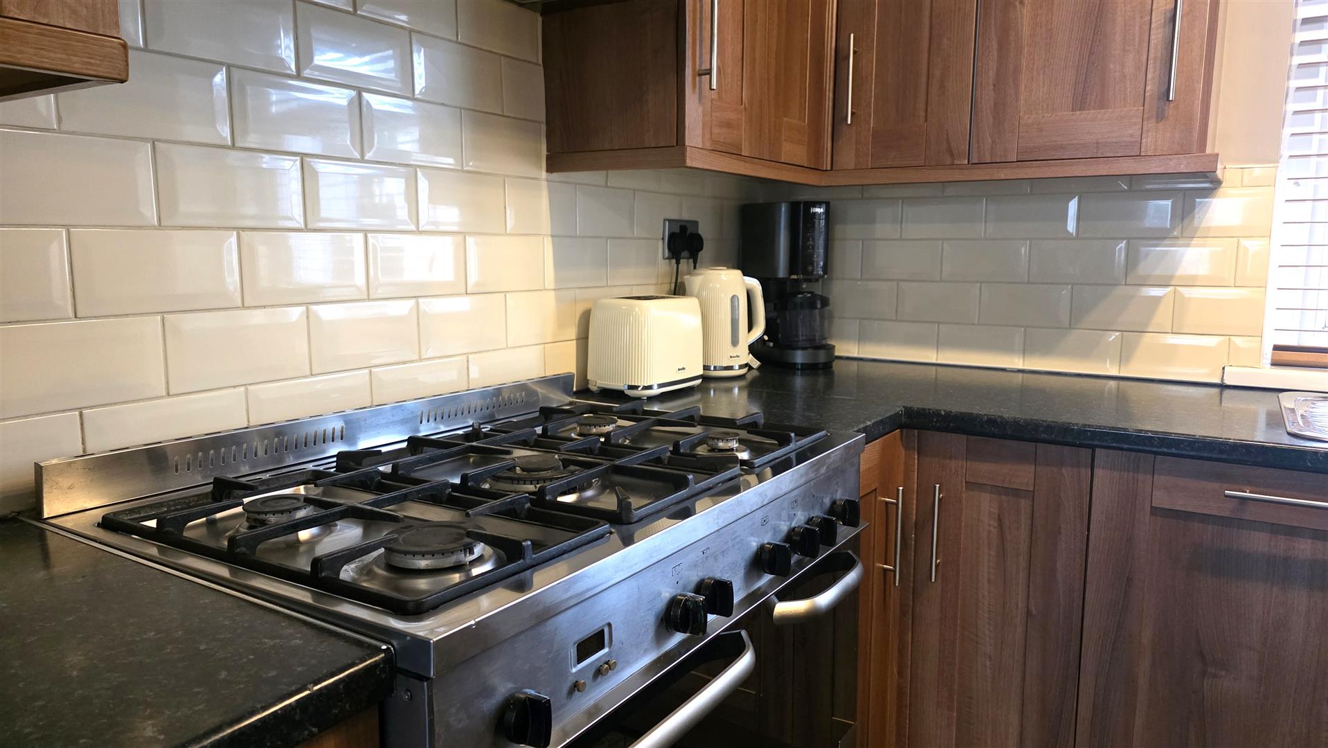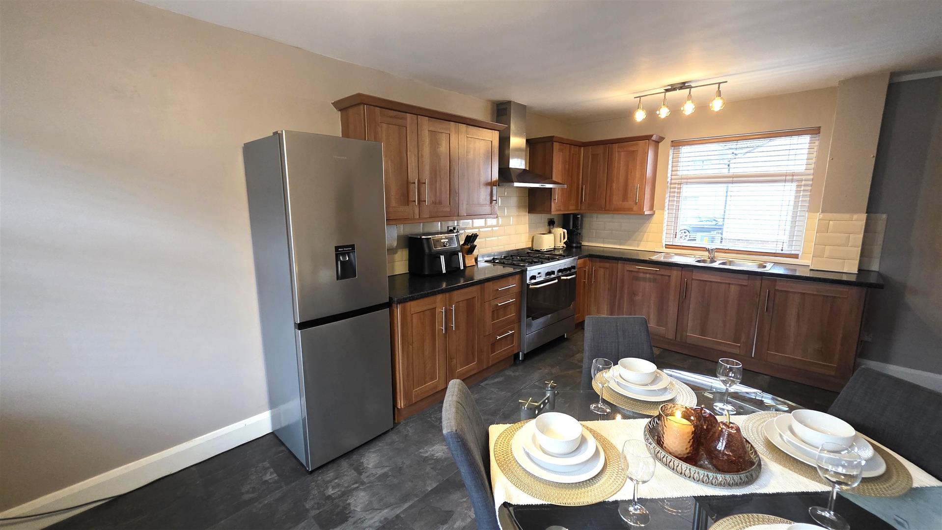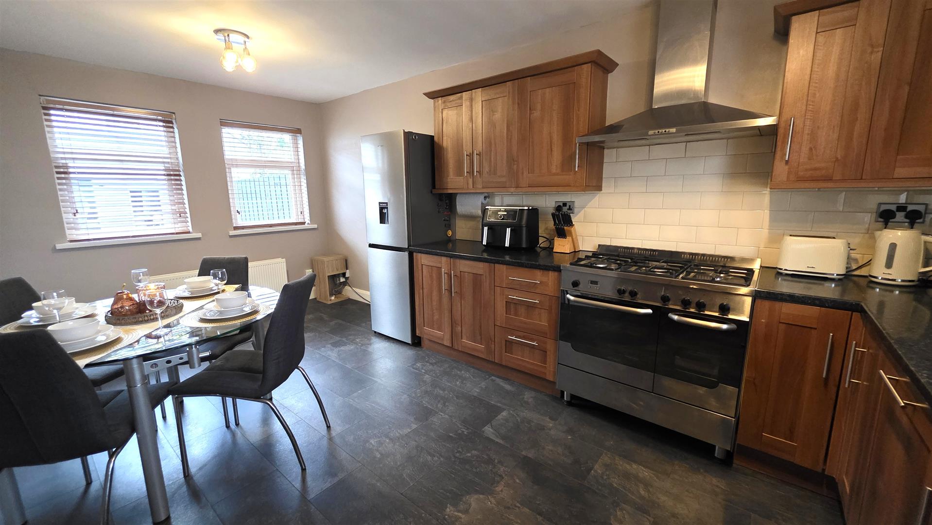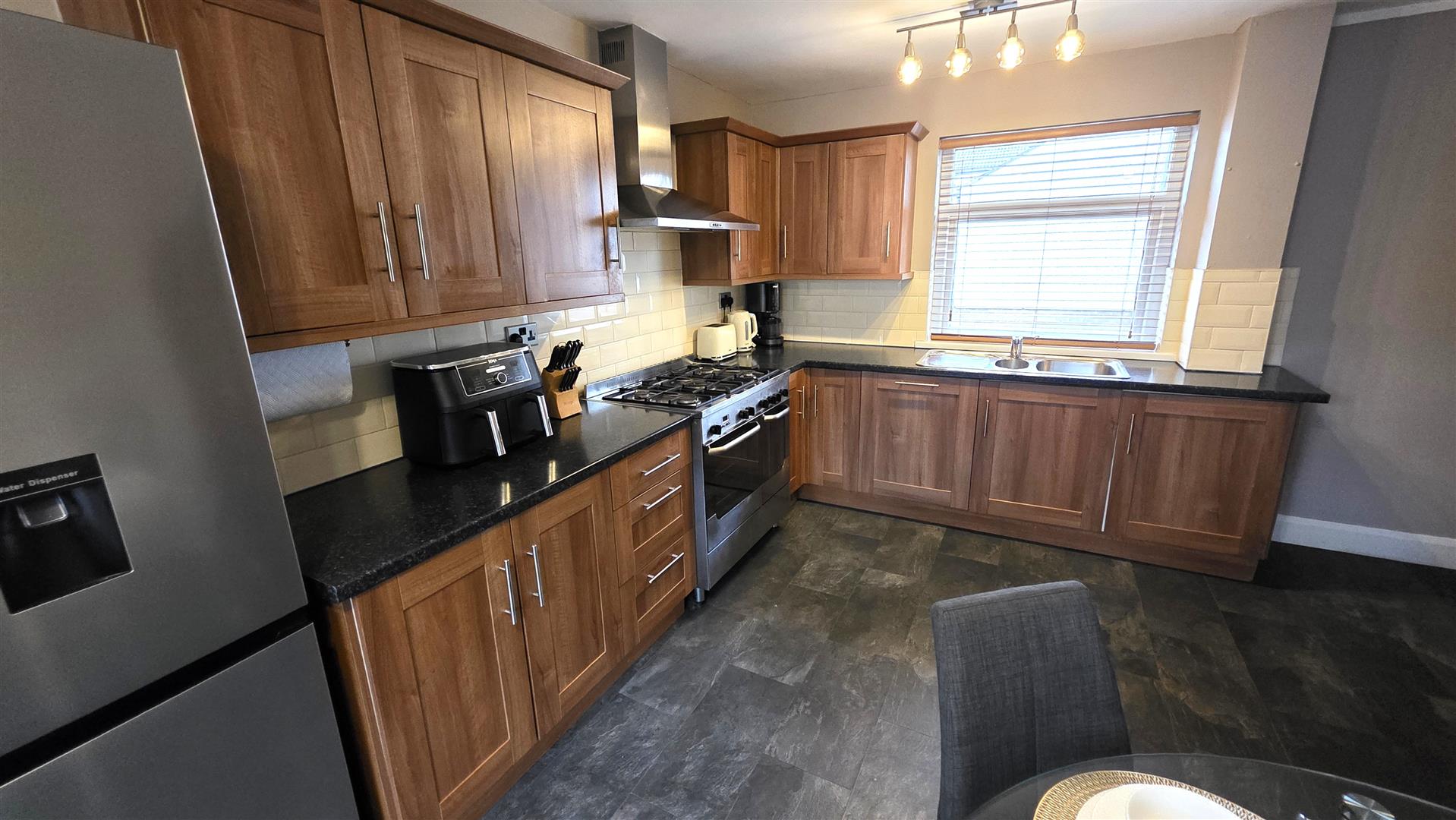 (At max). Full range of walnut effects shaker style, high and low level kitchen units with contrasting work surfaces and complimentary bevelled splashback tiling. One and one quarter bowls stainless steel sink unit with chrome mixer tap. 'New world' gas range cooker, with five hobs and double oven and grill. Integrated dishwasher and space for fridge freezer. Slate effect wood laminate flooring. Dual aspect windows. Double radiator.