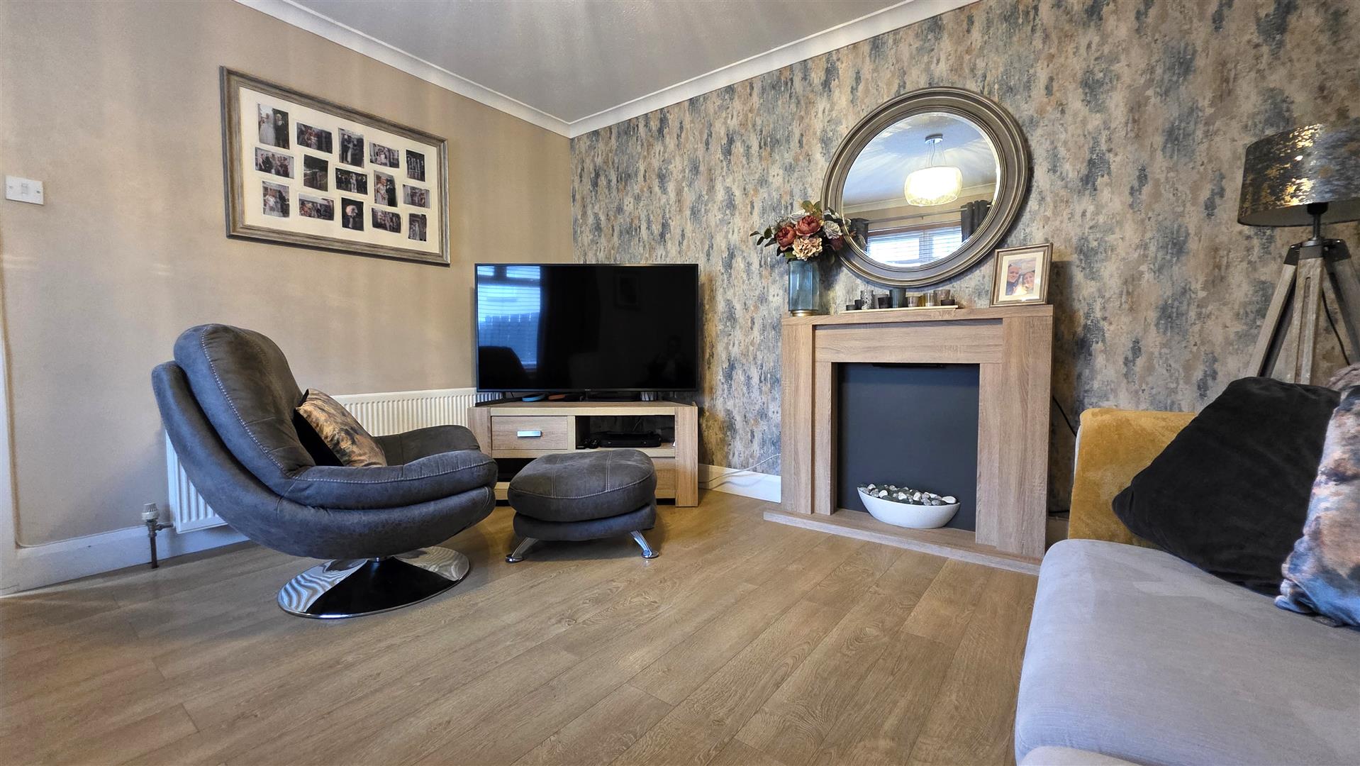 Slate effect wood laminate flooring. Single radiator.
