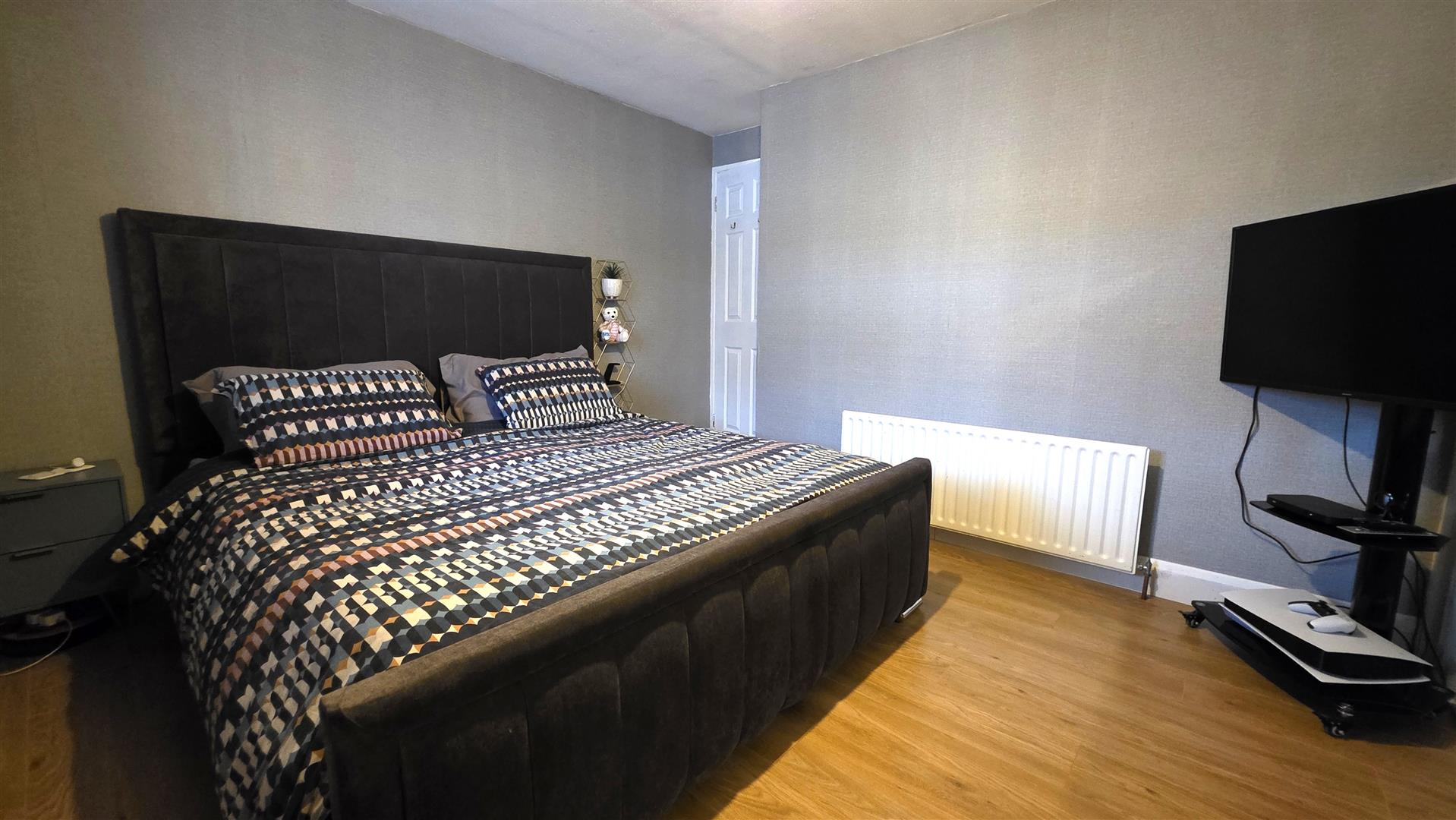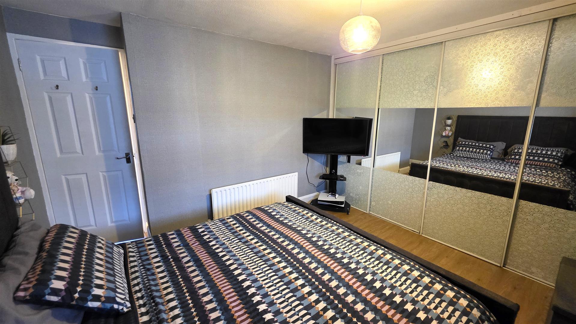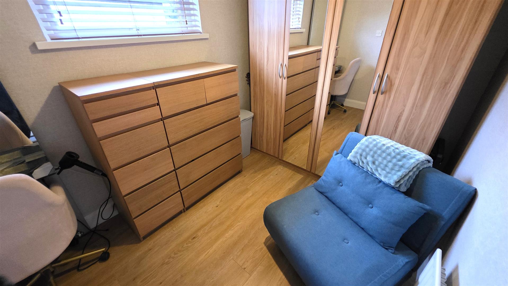 Wood laminate flooring. Integrated bedroom storage with shelving and clothing rails. Single radiator.