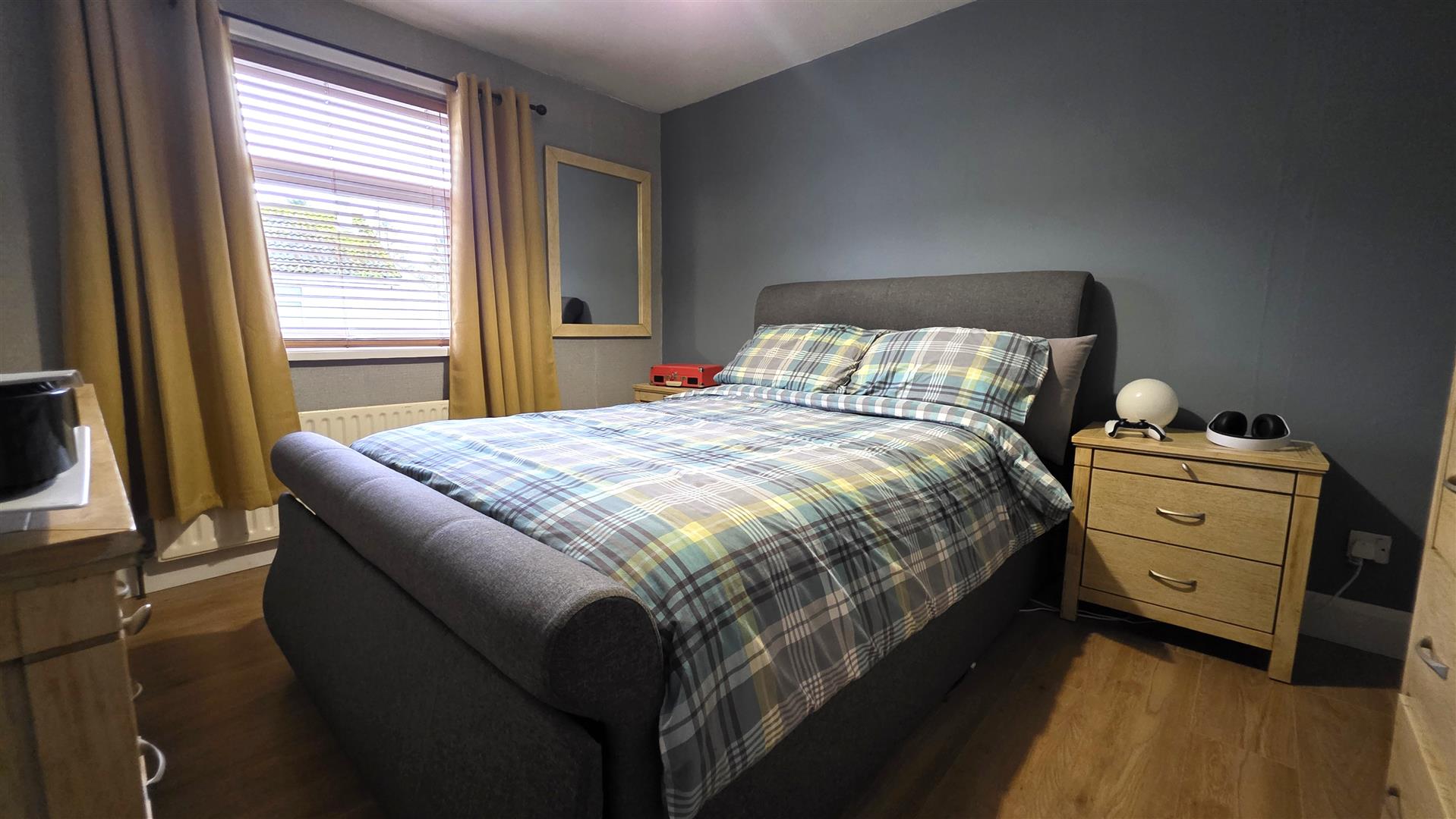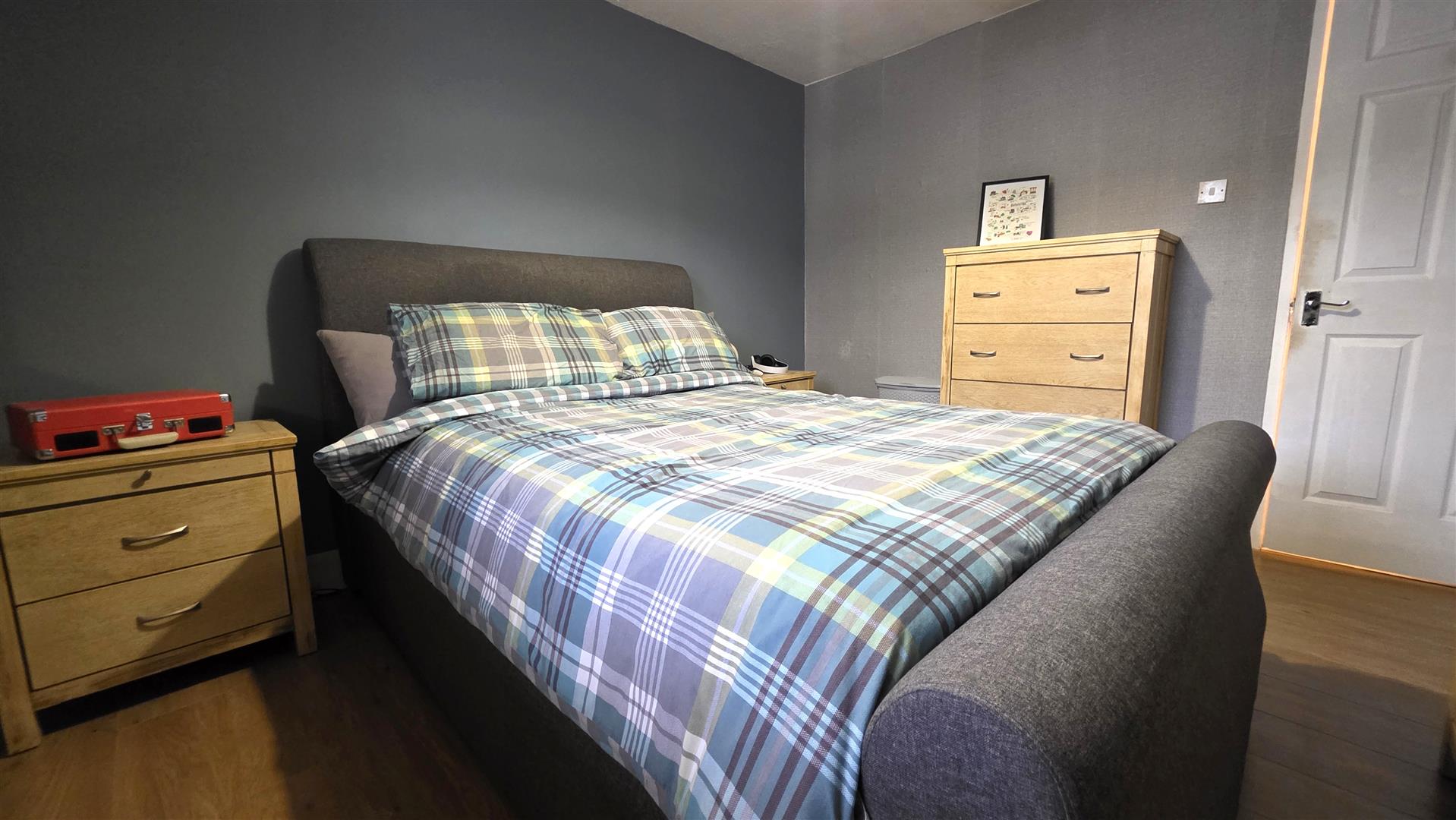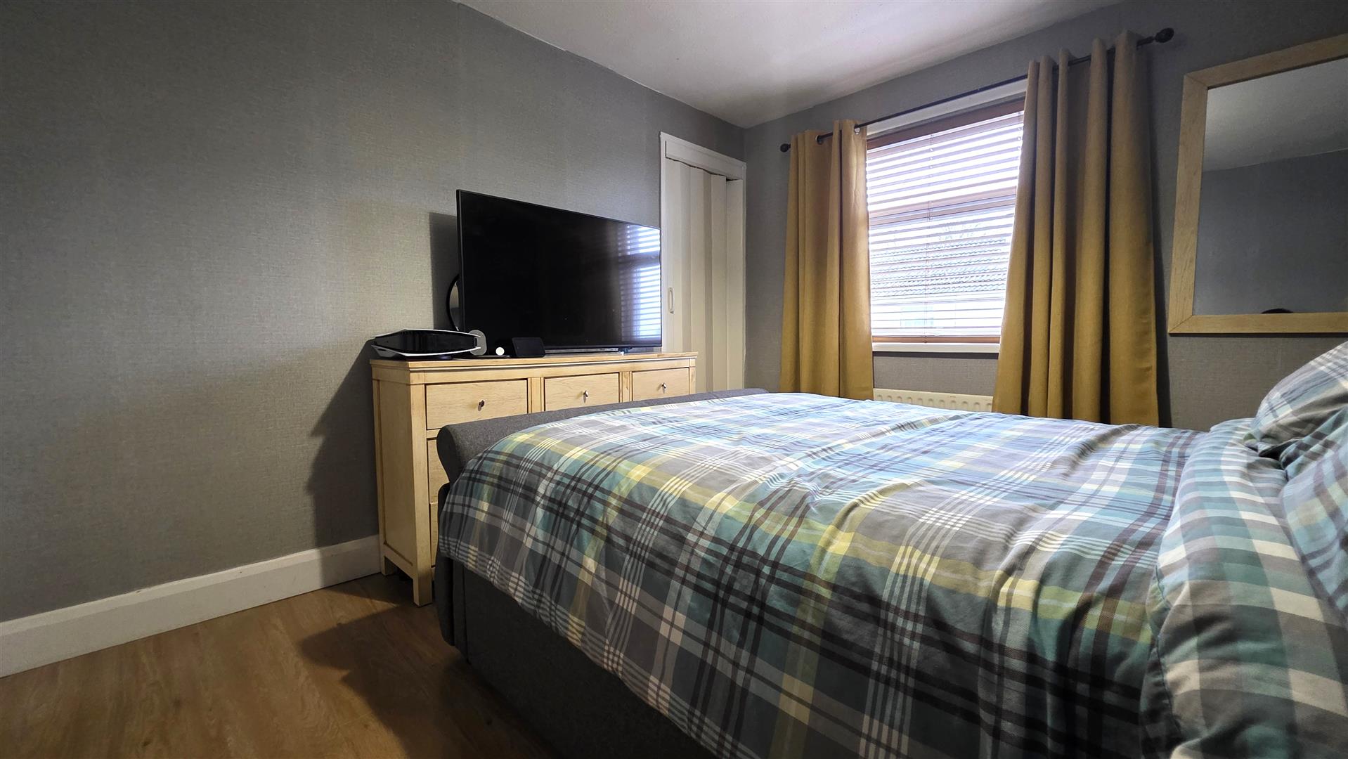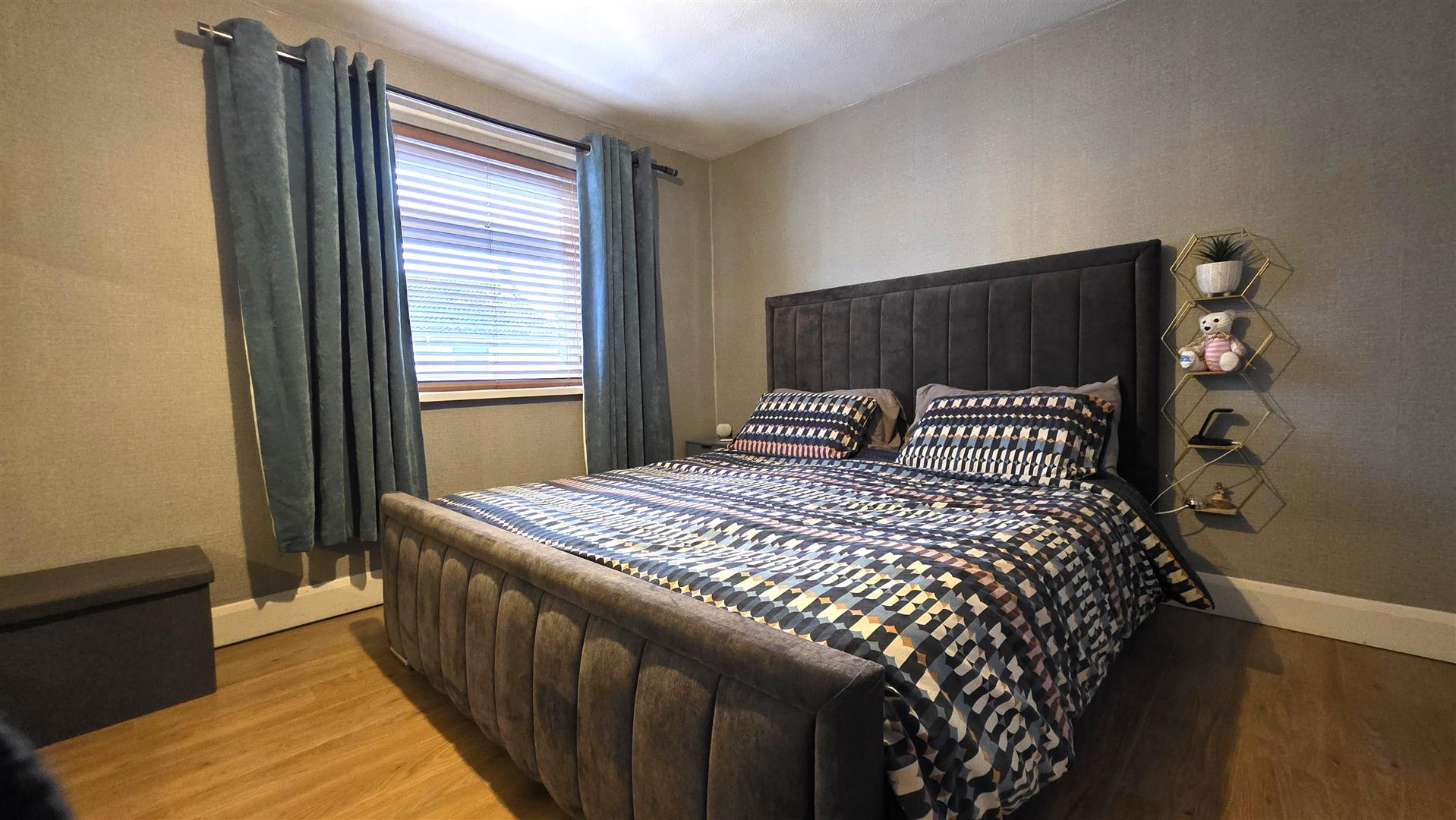 Wood laminate flooring. Integrated bedroom storage with shelving and clothing rails. Single radiator.