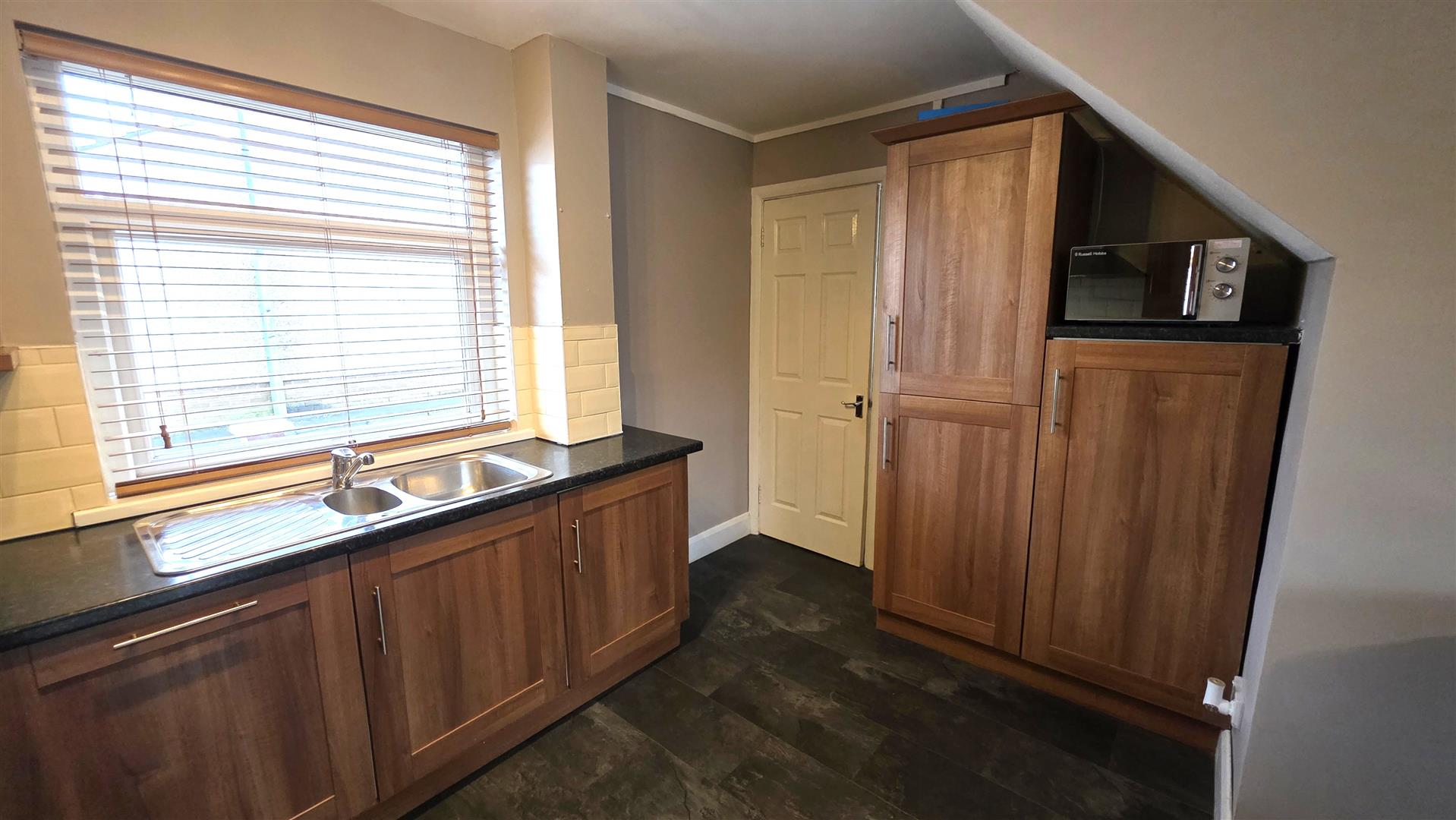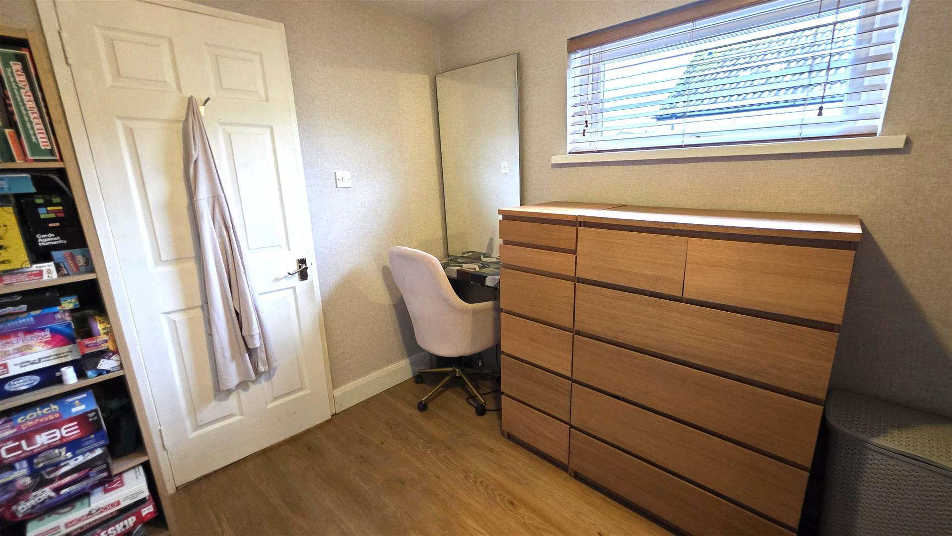 Integrated storage cupboard. Wood laminate flooring. Single radiator.