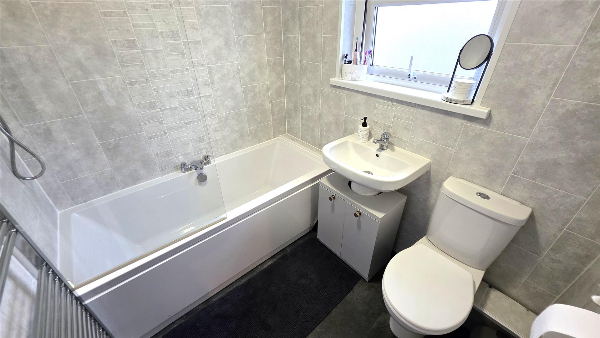 Bathroom with double ended panel bath and mains shower over