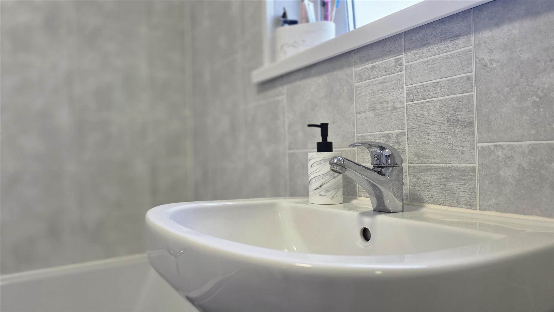 white suite comprising a vanity wash hand basin with stainless steel hot and cold taps. Low flush WC. Extractor fan.