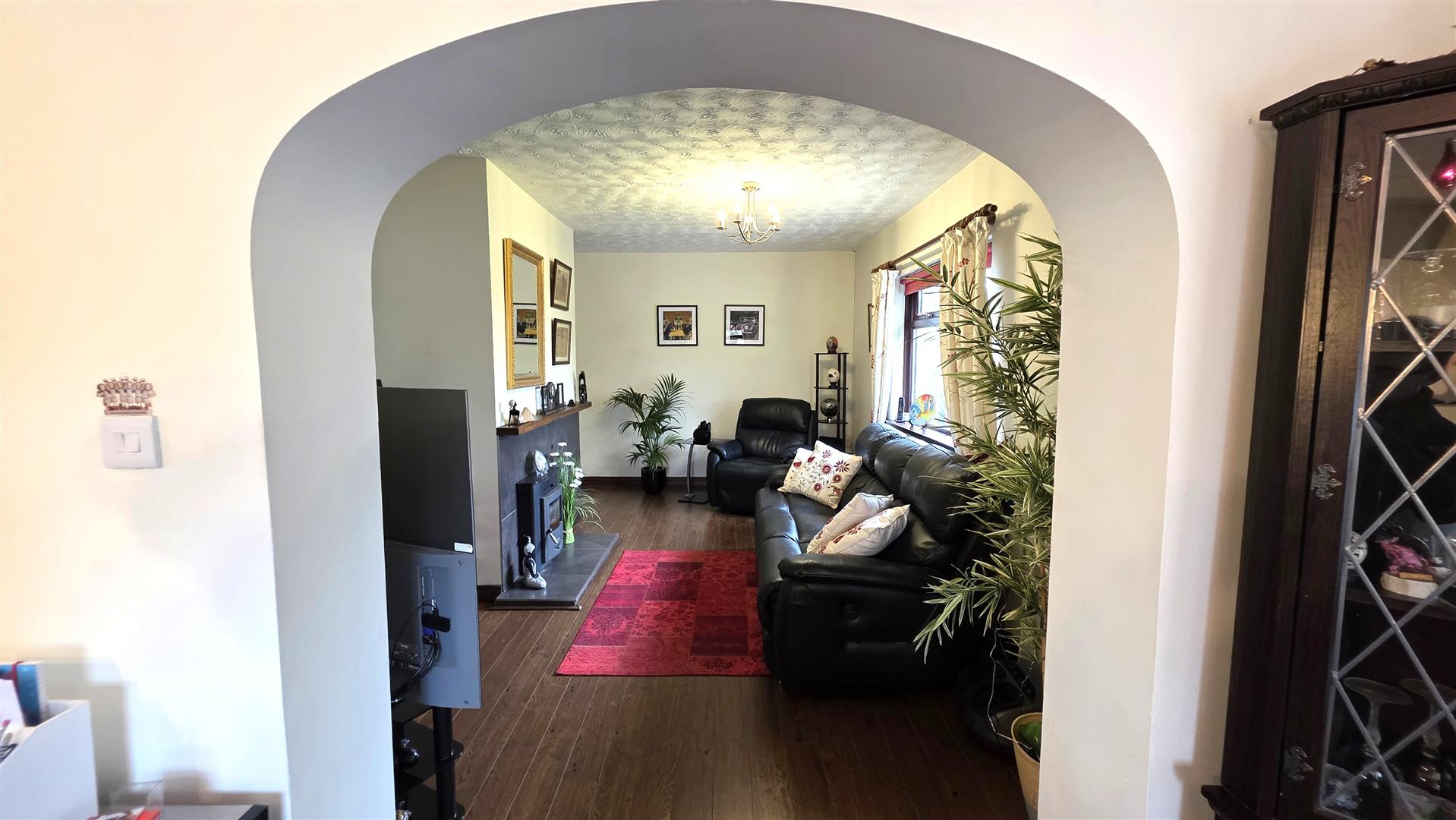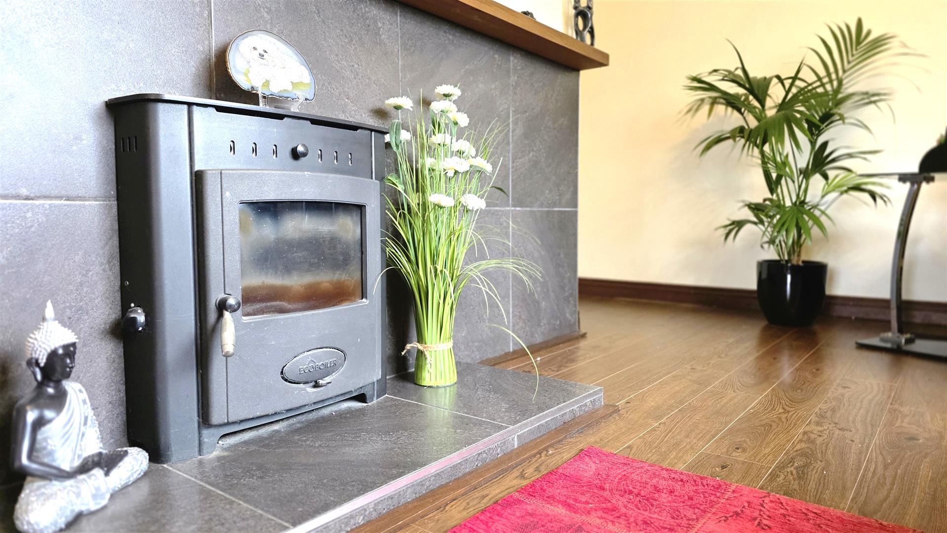 Living room with feature glass fronted solid fuel stove with back boiler / Open archway to;