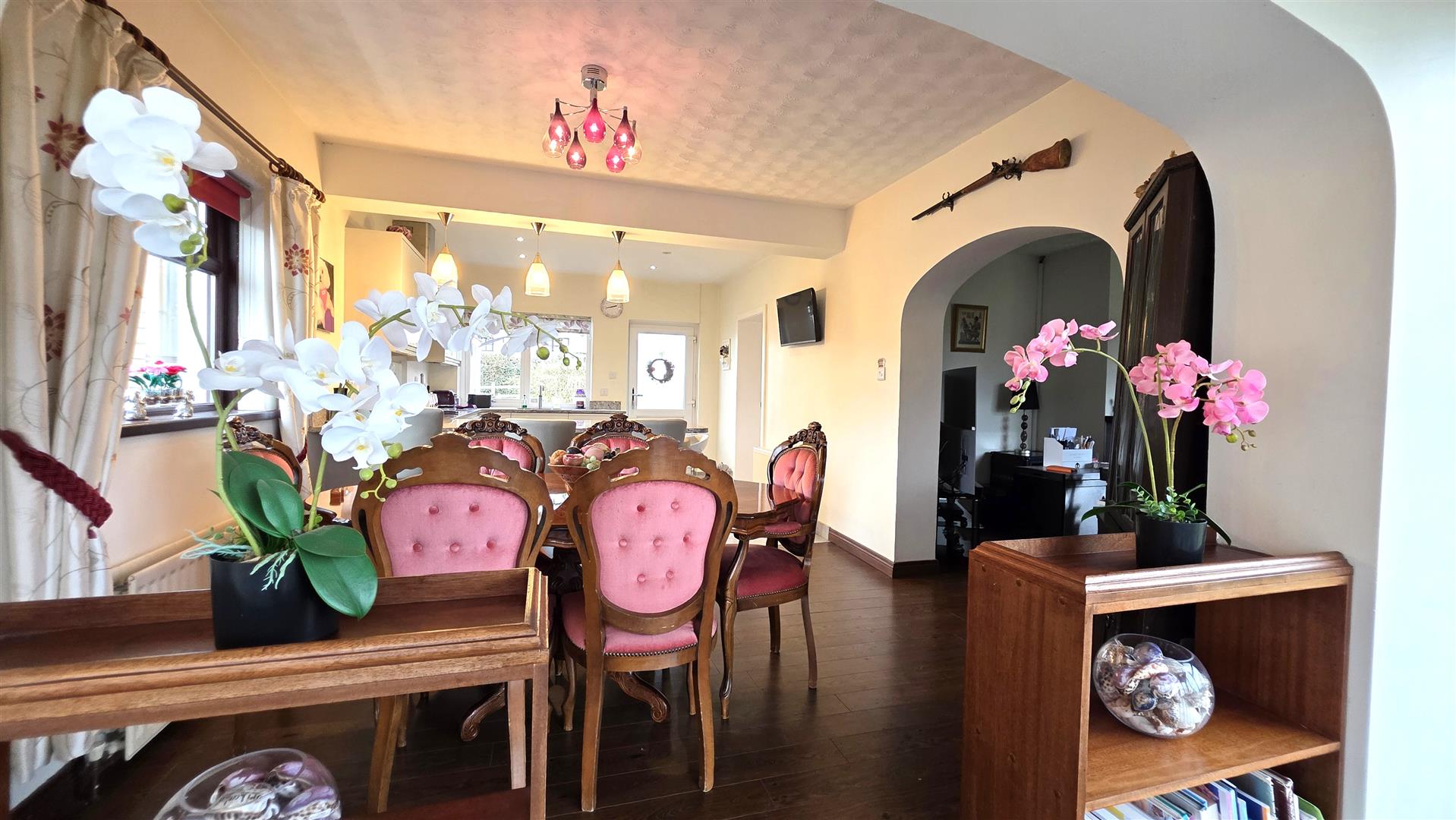 Dining room with walnut effect wood laminate floor / Open archway and steps down to Sunroom / Open to;