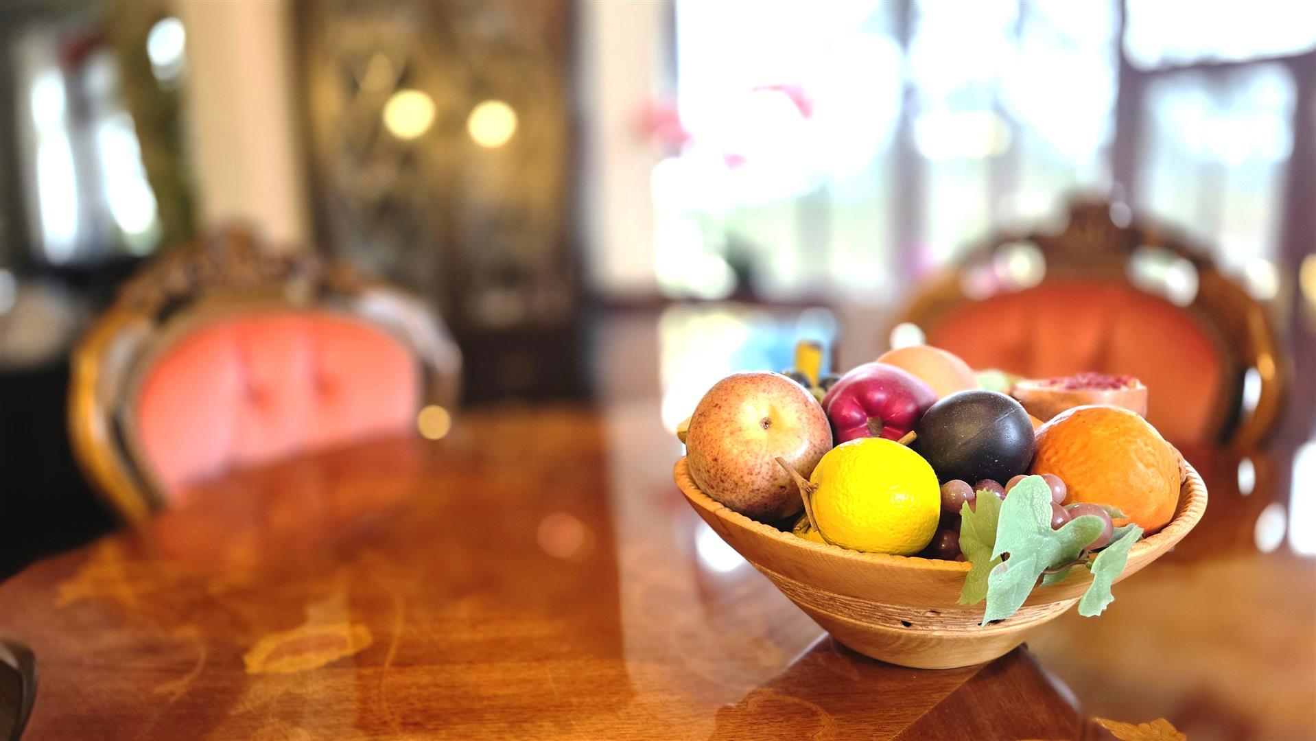 Semi-vaulted wood strip ceiling. Extra high windows. Mahogany effect PVC double glazed French doors to tegula brick patio. Wooden steps up through open archway to dining.
