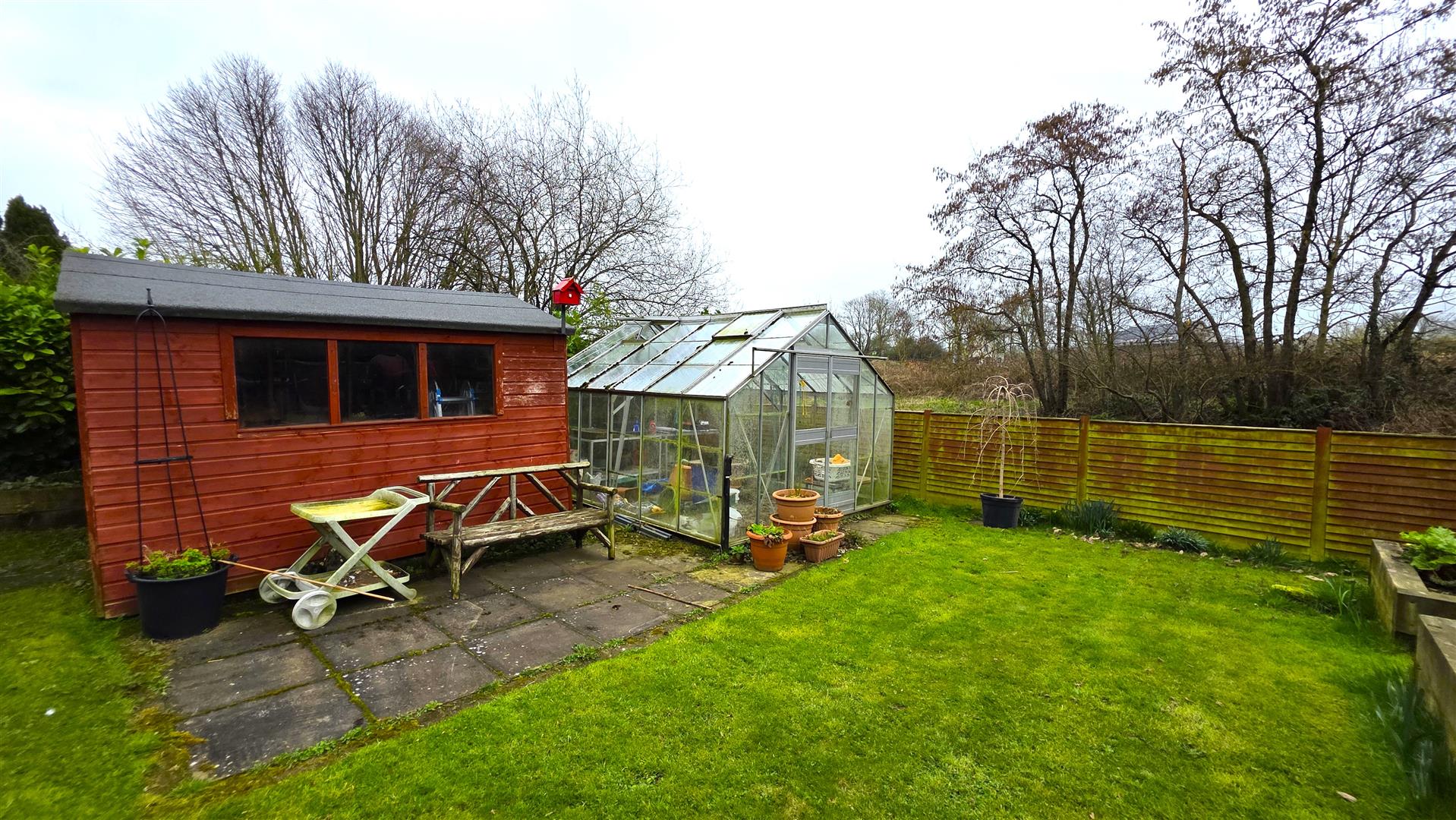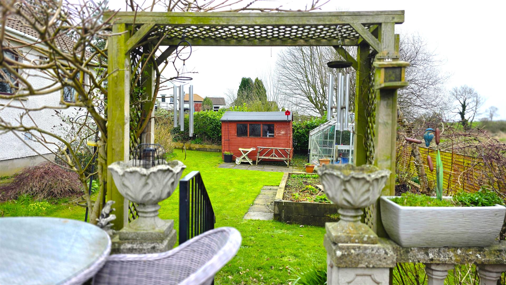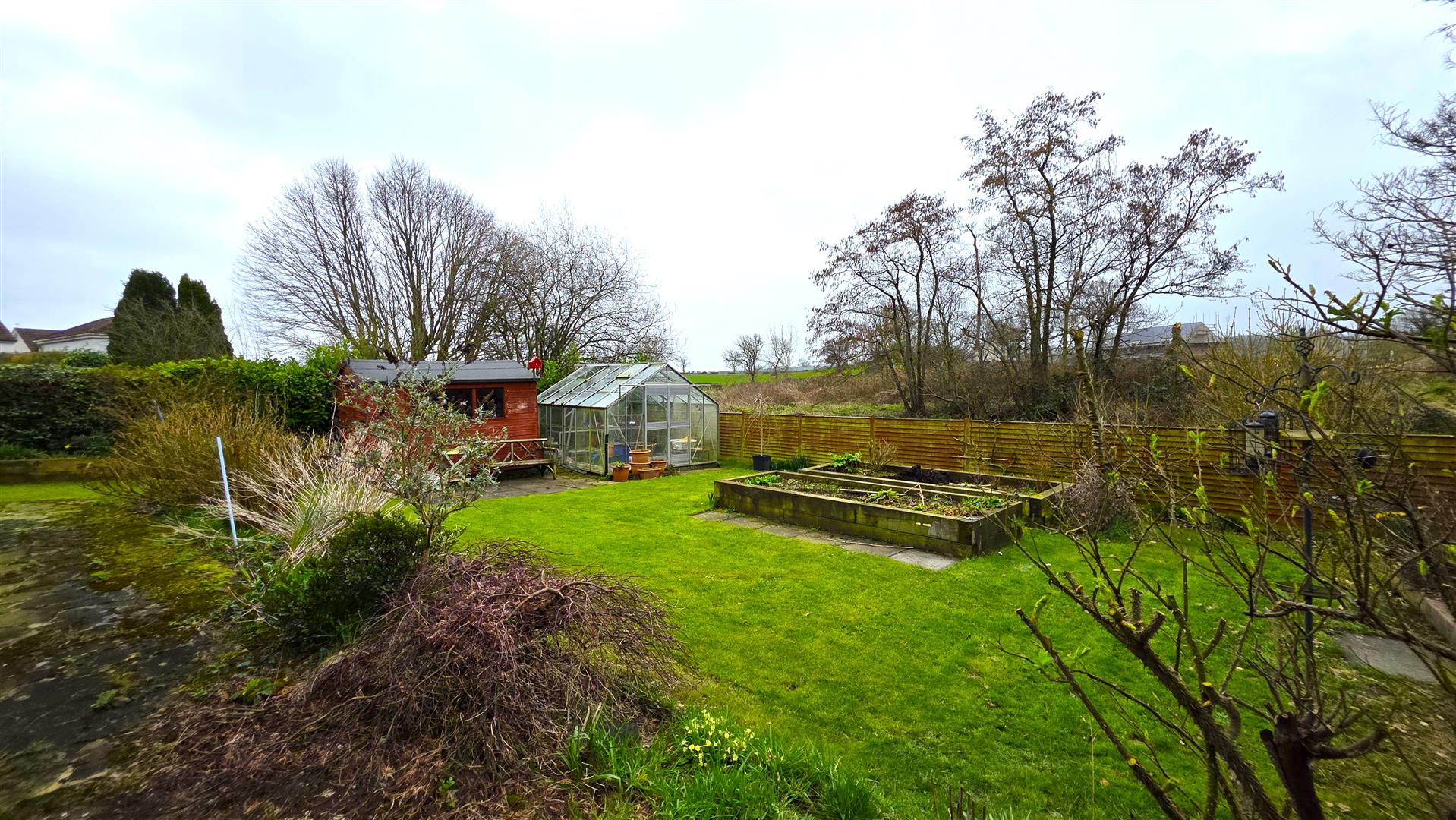 Garden to front in neat lawn, well stocked borders and specimen trees. Potential vehicular access to left hand side. Tarmac path leading to crazy paved pathway. Side garden in lawns. Outside tap. PVC tank. Generous garden to rear in neat lawn, paved patio. Crazy paved pathway. Lapboard fencing. Timber shed. Greenhouse. Raised planter beds. Steps up through pergola to raised tegula brick patio with access to sun room. Low level direct concrete balustrade. Three outside taps and double socket for hot tub. Access to boiler house / store attached to rear of garage.