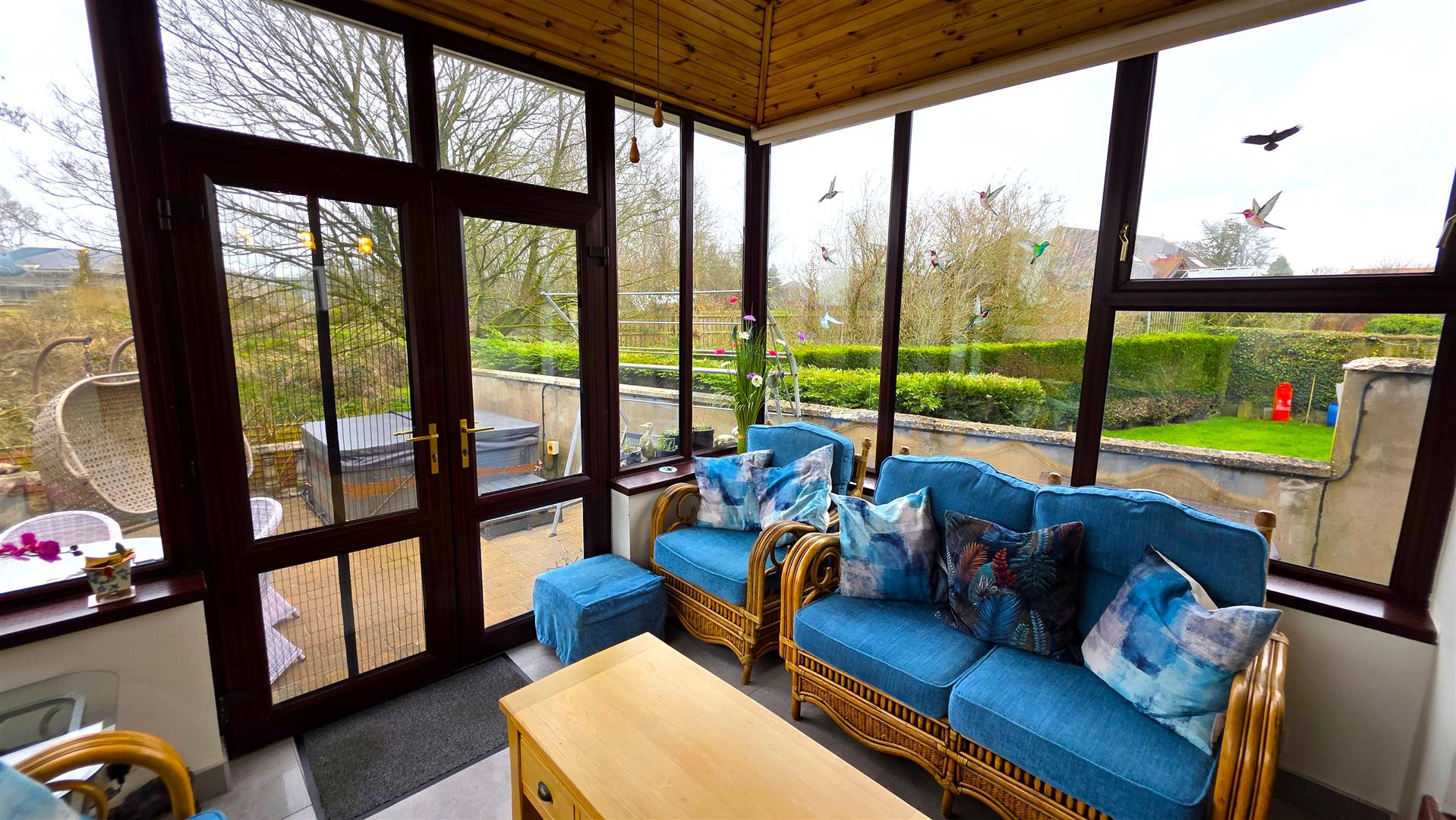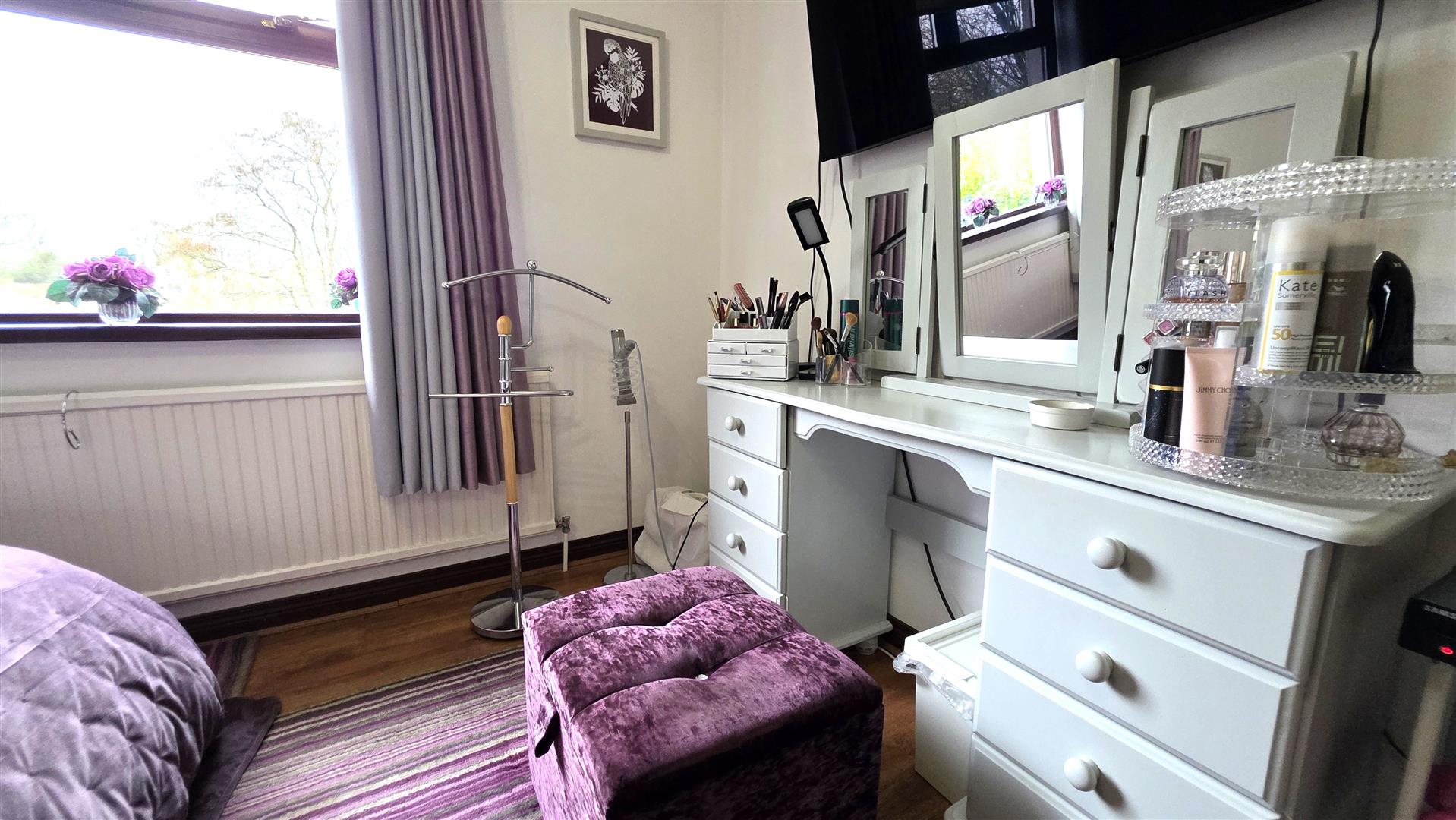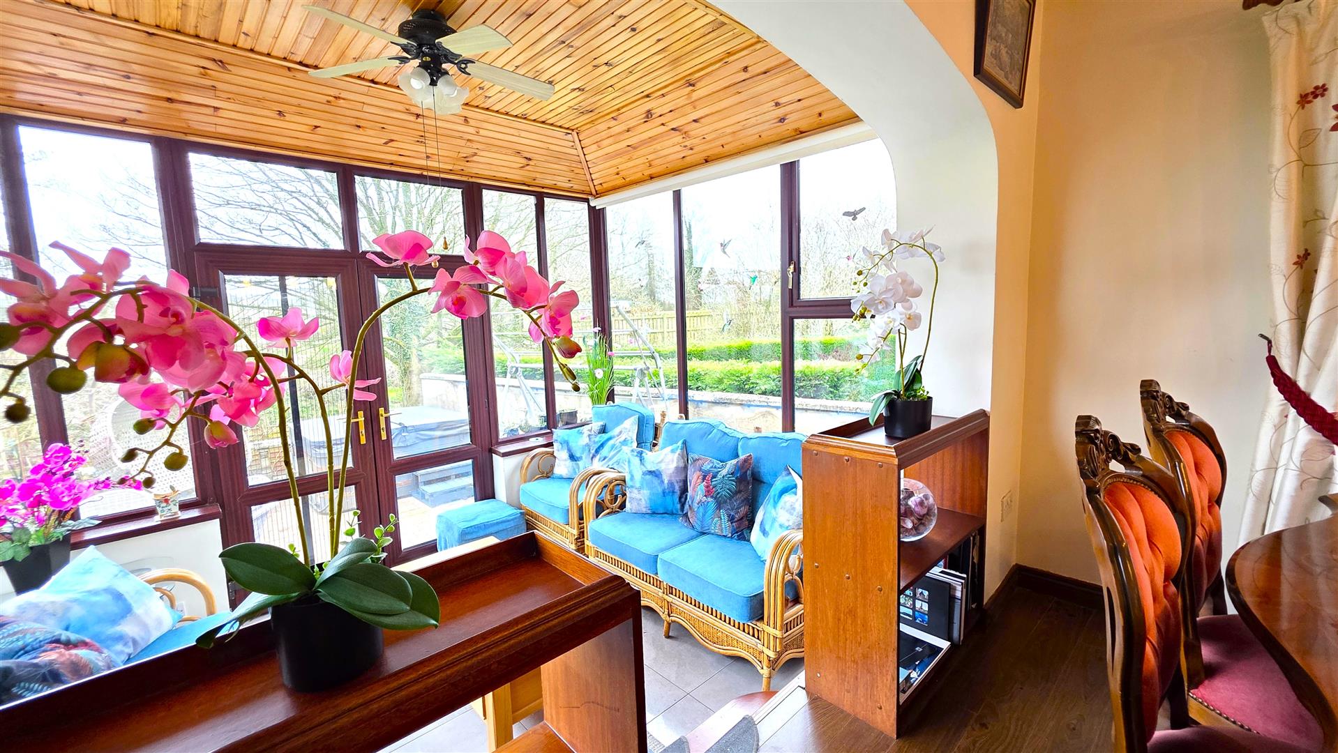 Garden to front in neat lawn, well stocked borders and specimen trees. Potential vehicular access to left hand side. Tarmac path leading to crazy paved pathway. Side garden in lawns. Outside tap. PVC tank. Generous garden to rear in neat lawn, paved patio. Crazy paved pathway. Lapboard fencing. Timber shed. Greenhouse. Raised planter beds. Steps up through pergola to raised tegula brick patio with access to sun room. Low level direct concrete balustrade. Three outside taps and double socket for hot tub. Access to boiler house / store attached to rear of garage.