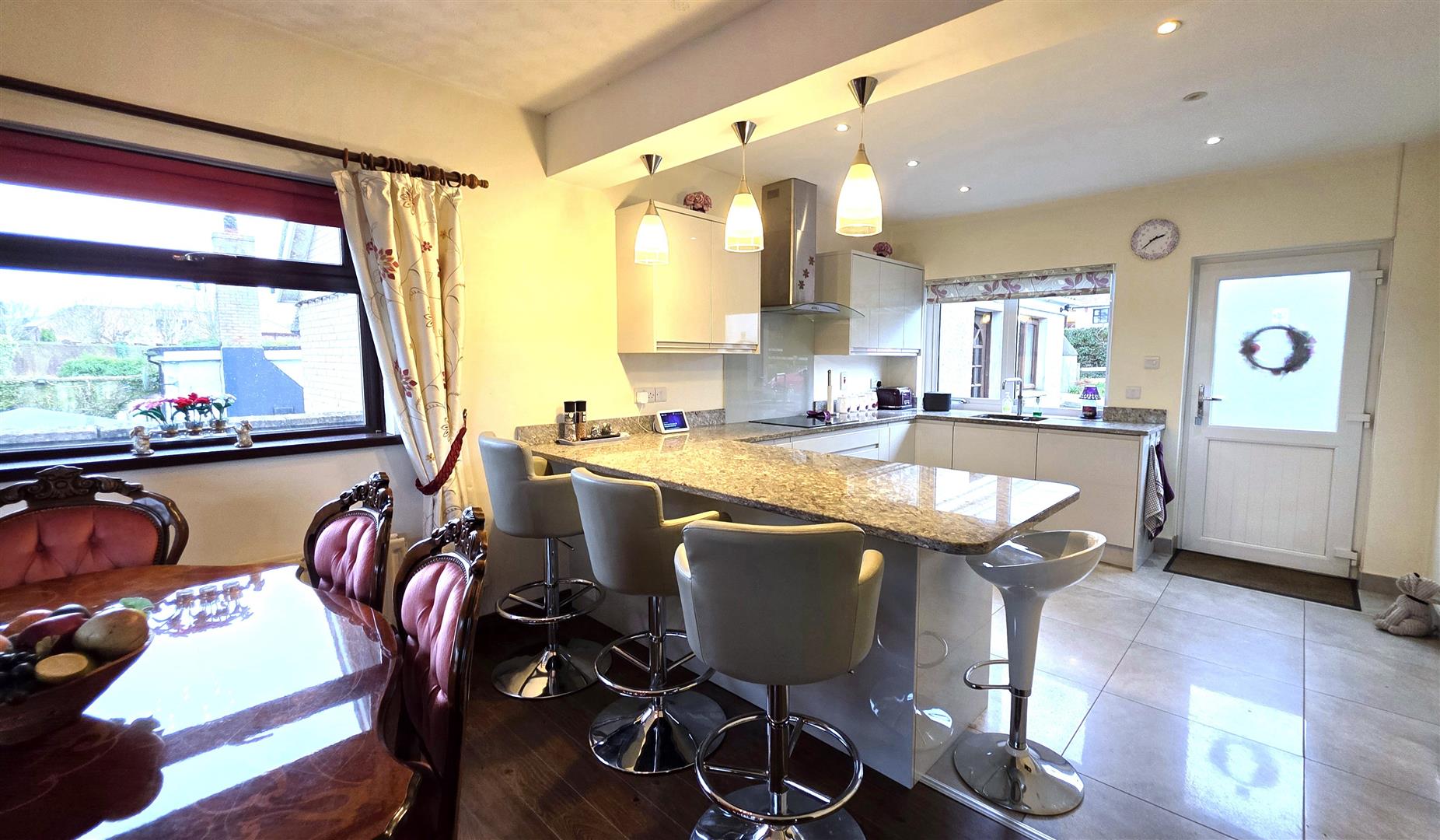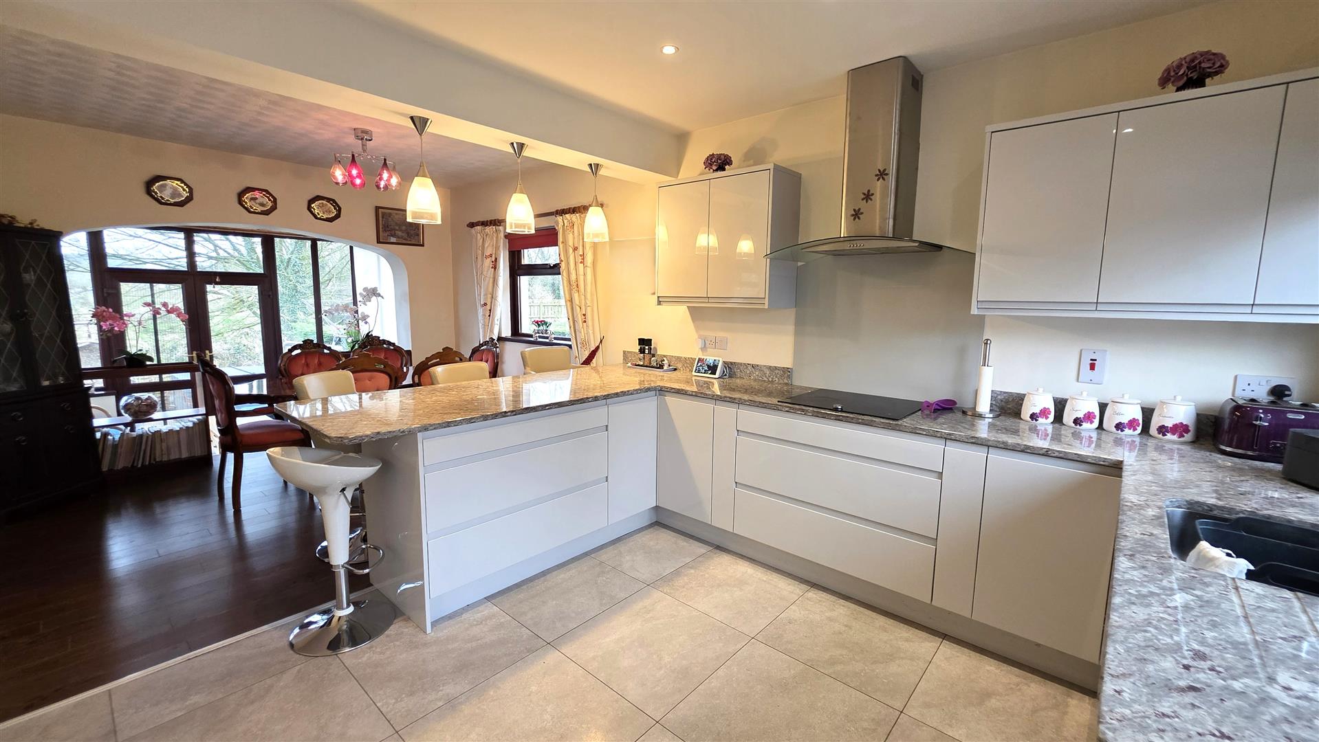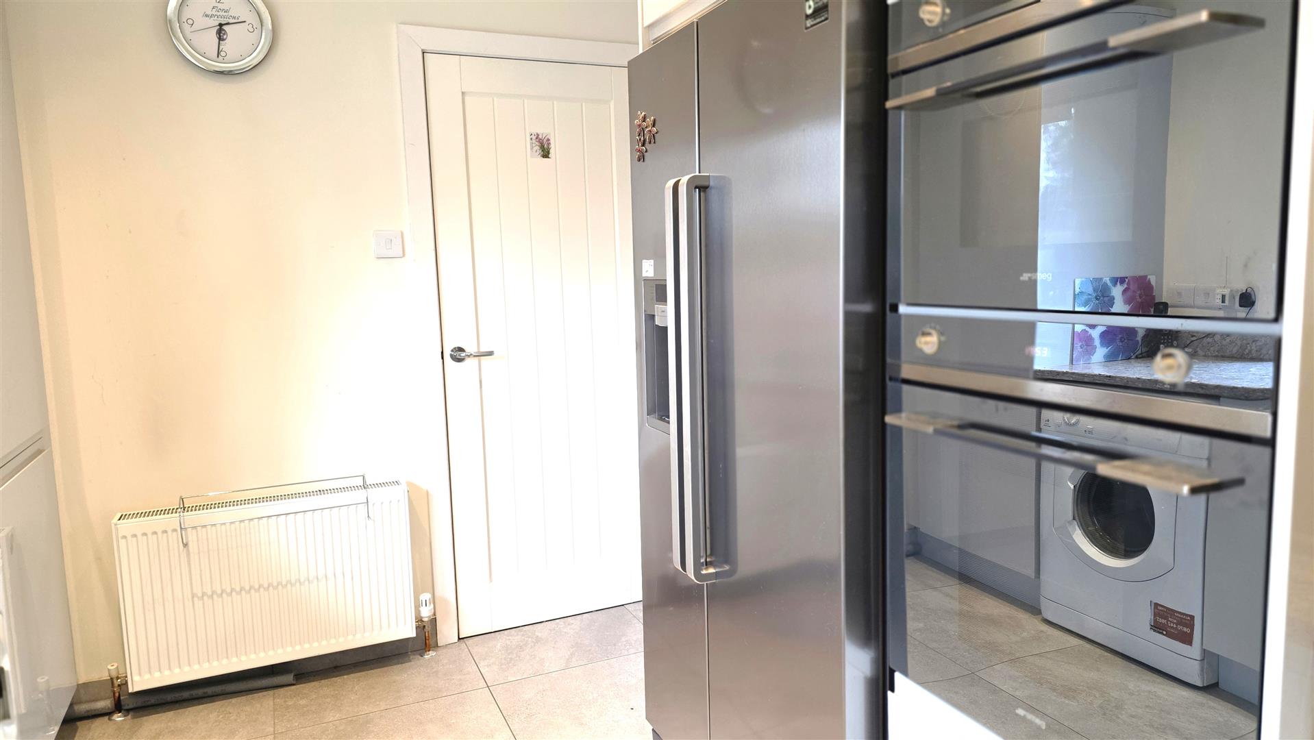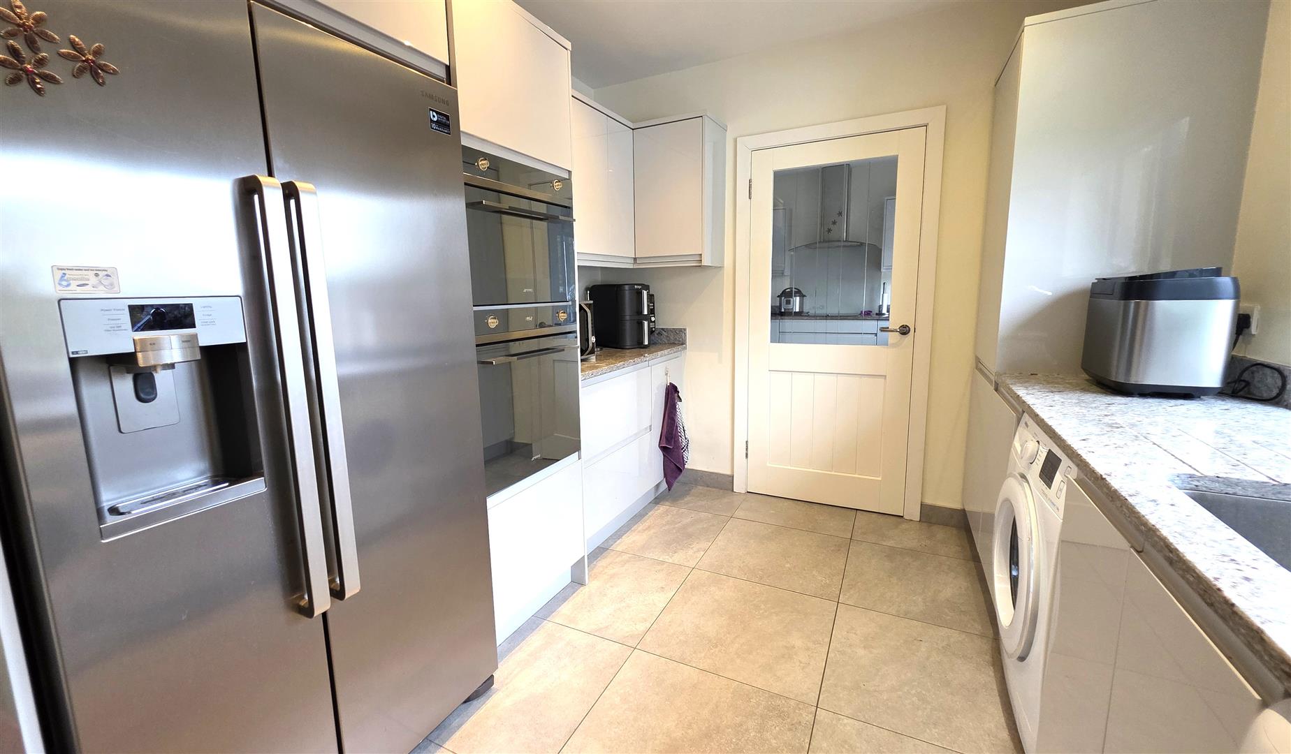 Full range of matching light grey high gloss high and low level units with complimentary polished granite work surfaces, matching up stands and window cill. "Smeg" mid level integrated oven and separate grill. Larder cupboard with pull-out drawer displays. Matching broom cupboard. Separator bins. Plumbed for "American" style fridge freezer. Plumbed for washing machine and space for dryer. Low voltage downlights. Fully tiled floor.