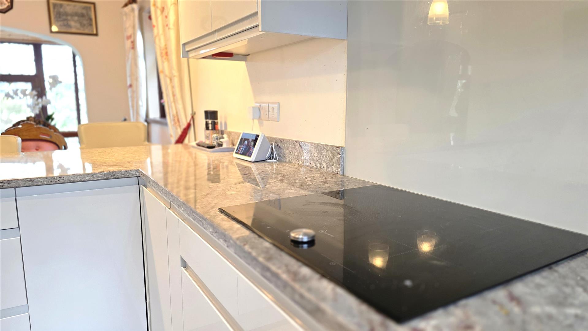 Full range of light grey high gloss high and low level units with complimentary polished granite work surfaces. Matching up stands and four seater breakfast bar. Inlaid stainless steel sink unit with "Quooker" boiling water tap and fluted drainer. "Neff" induction hob with stainless steel and glass overhead extractor. Integrated dishwasher. Dual carousal retractable corner units. Pull-out spice cupboard. Fully tiled floor. High level TV point. Low voltage downlights. Double radiator. Part glazed door to: