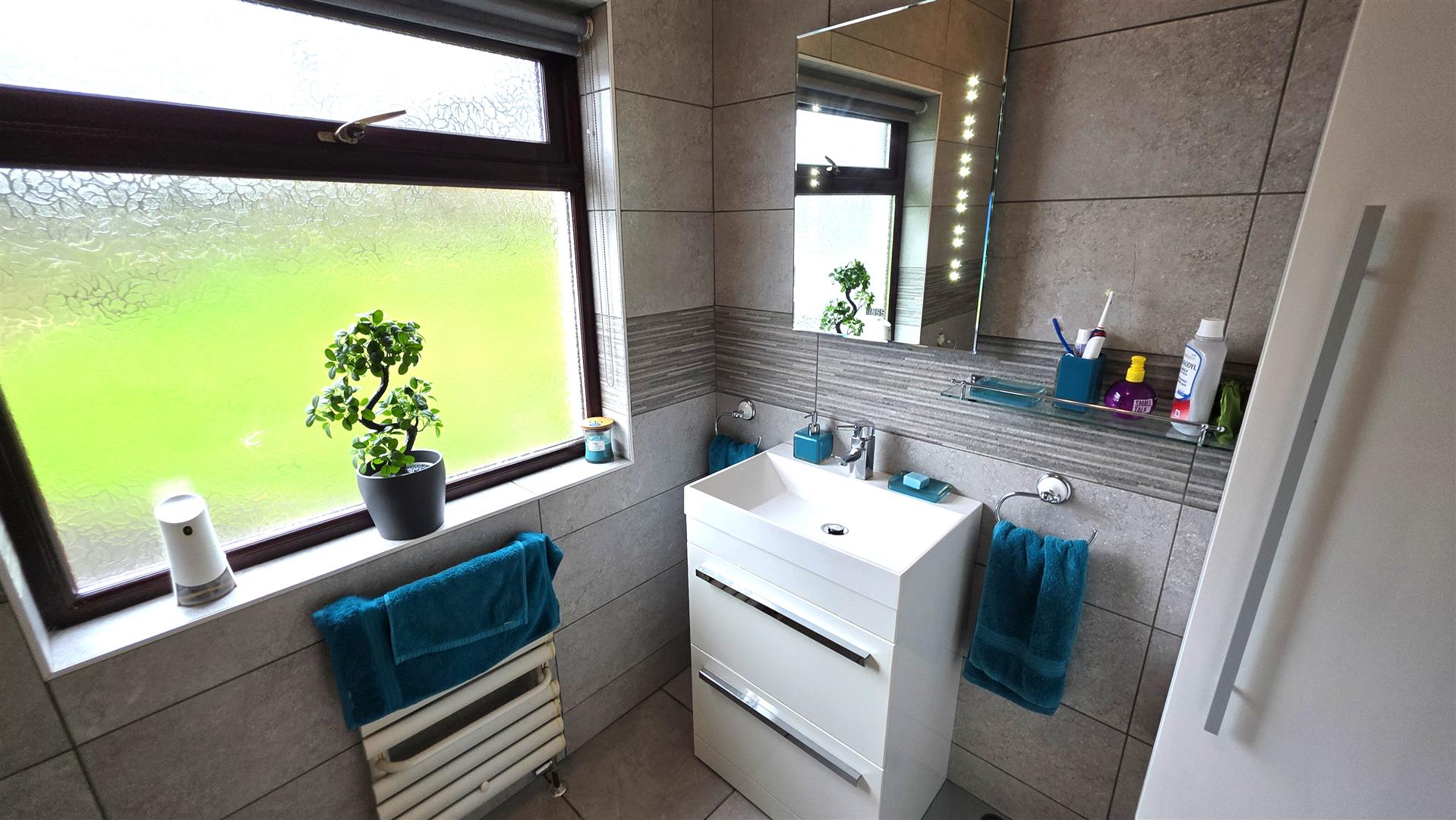 Modern white suite comprising fully tiled corner quadrant shower cubicle with "Redring" electric shower unit and sliding cubicle doors. Push button low flush W/C and moulded wash hand basin in vanity unit with feature mixer taps and storage drawers below. Fully tiled walls and floor. PVC strip ceiling. Feature heated towel radiator.