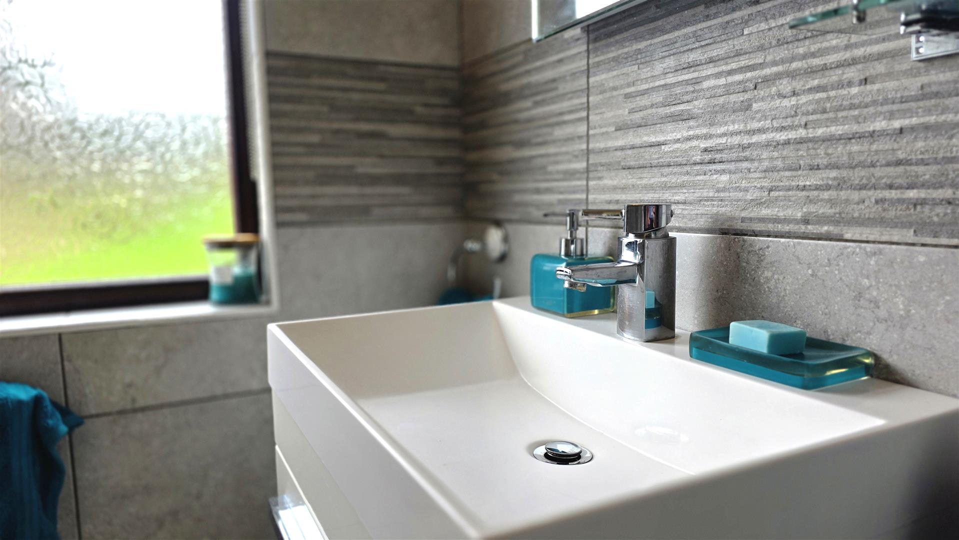 Shower room with modern white suite to include fully tiled corner shower cubicle and wash hand basin in vanity unit