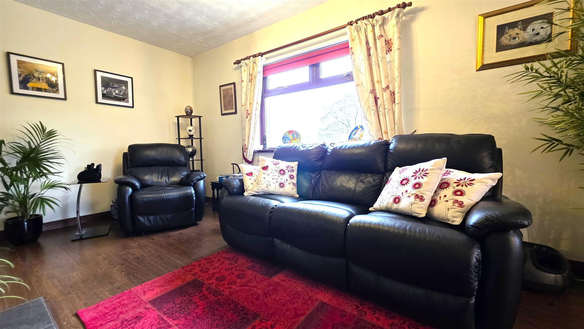 Feature glass fronted solid fuel stove with a back boiler, extended tiled surround and matching hearth. Walnut effect wood laminate floor. Single radiator. Open archway to: