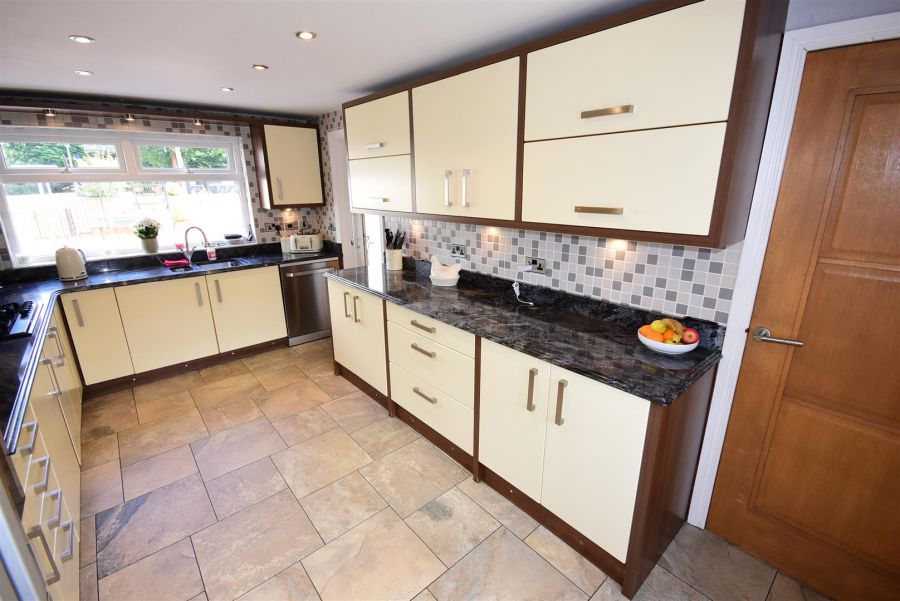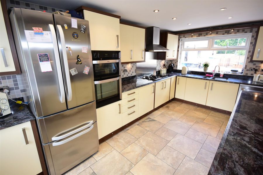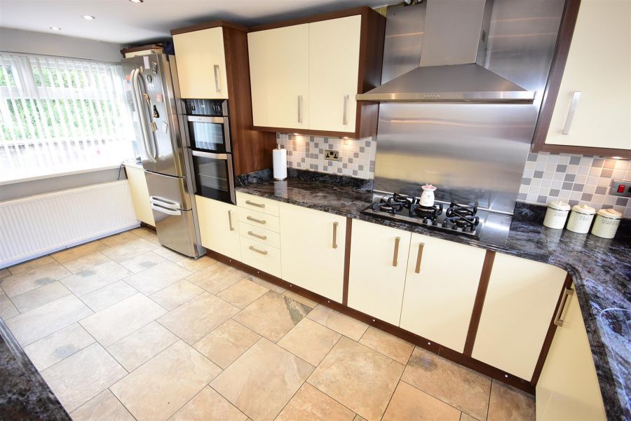 Full range of cream coloured high and low level units with feature chrome handles, walnut trim and gable ends. Inlaid one and a quarter bowl stainless steel sink unit with mixer taps and directional head. Contrasting polished granite work surfaces with matching upstands and fluted drainer. Inset five ring gas hob with stainless steel splash back and wide pyramid style over head extractor. Mid level double oven. Space for fridge freezer and plumbed for dish washer. Part tiled walls to work surfaces. Dual aspect windows. Low voltage down lights. Fully tiled floor. Single radiator.