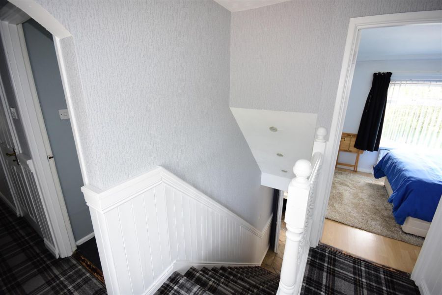 Painted moulded hand rail and turned balustrade to staircase. Half wood panelled walls. Access to loft. Hot press with copper cylinder and shelving above.
