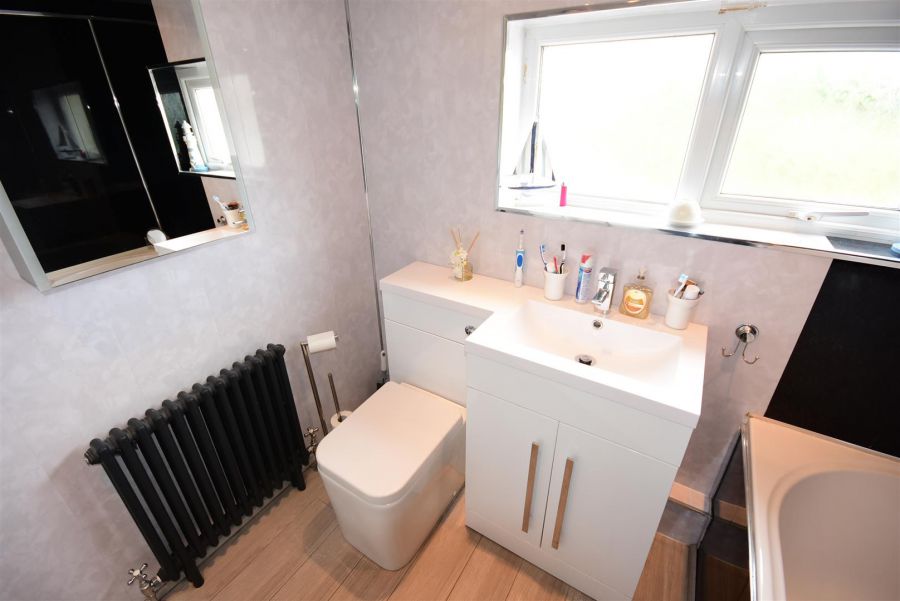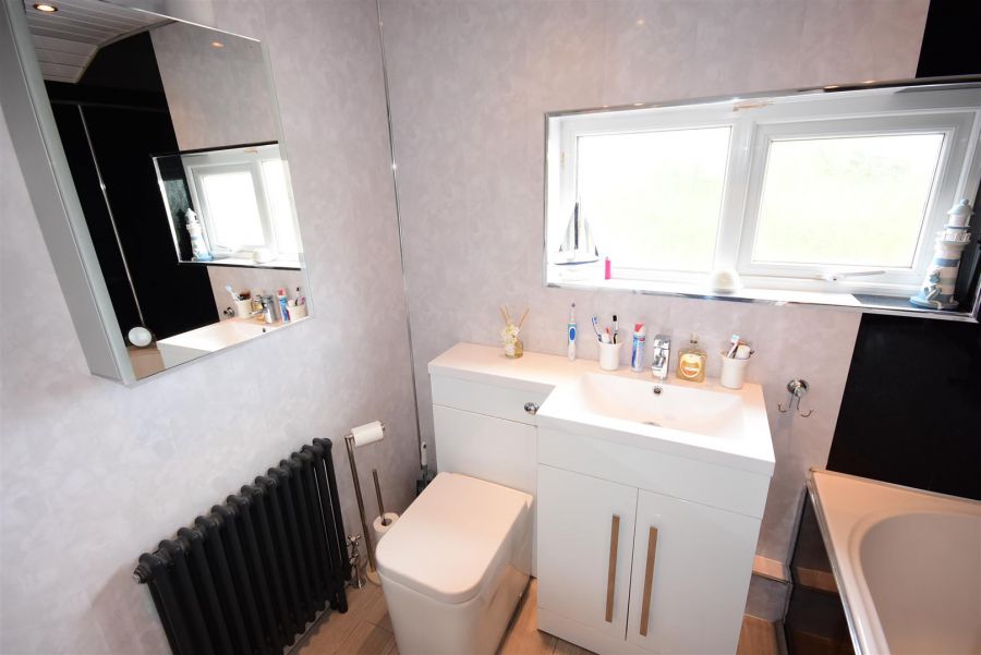 Modern white suite comprising double ended panelled bath with off set taps and "Mira Event" electric shower over. Glazed screen. Moulded unit comprising push button concealed flush W/C and wash hand basin in vanity with feature mixer taps and storage below. PVC panelled walls and ceiling. Wood grain effect wood laminate floor. Low voltage down lights. Extractor fan. Old school cast iron radiator.