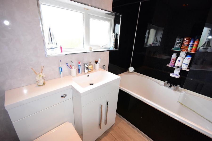 Family bathroom with modern white suite to include double ended panel bath with off-set taps and electric shower over