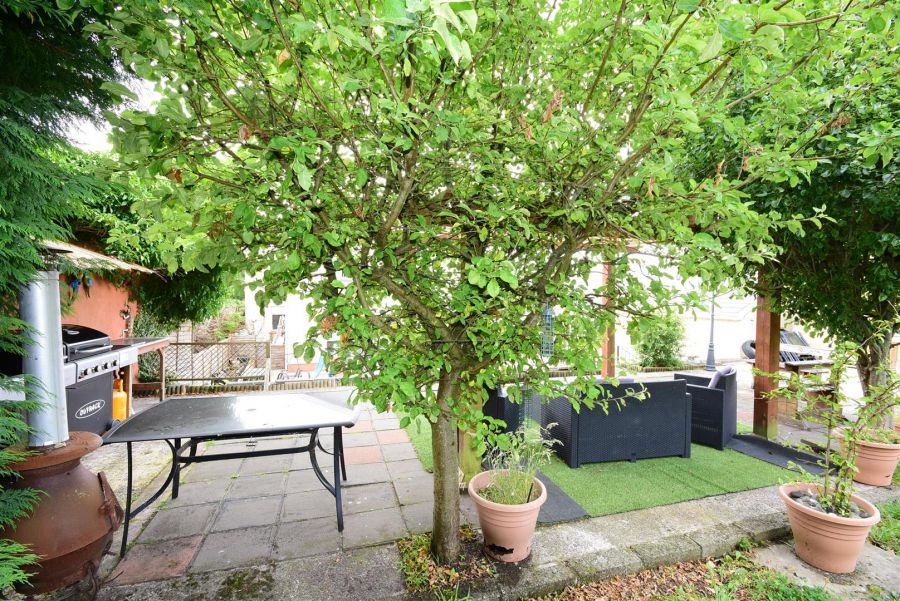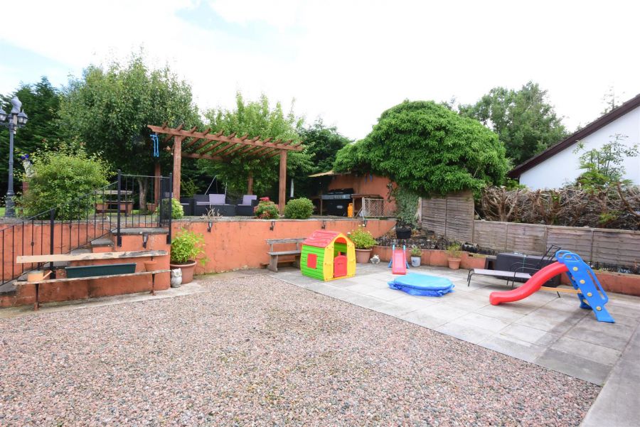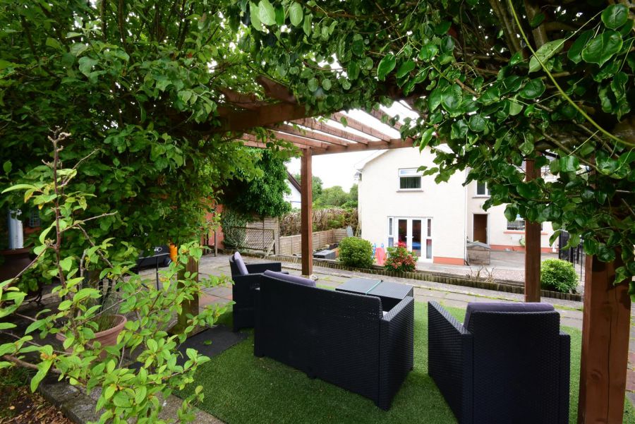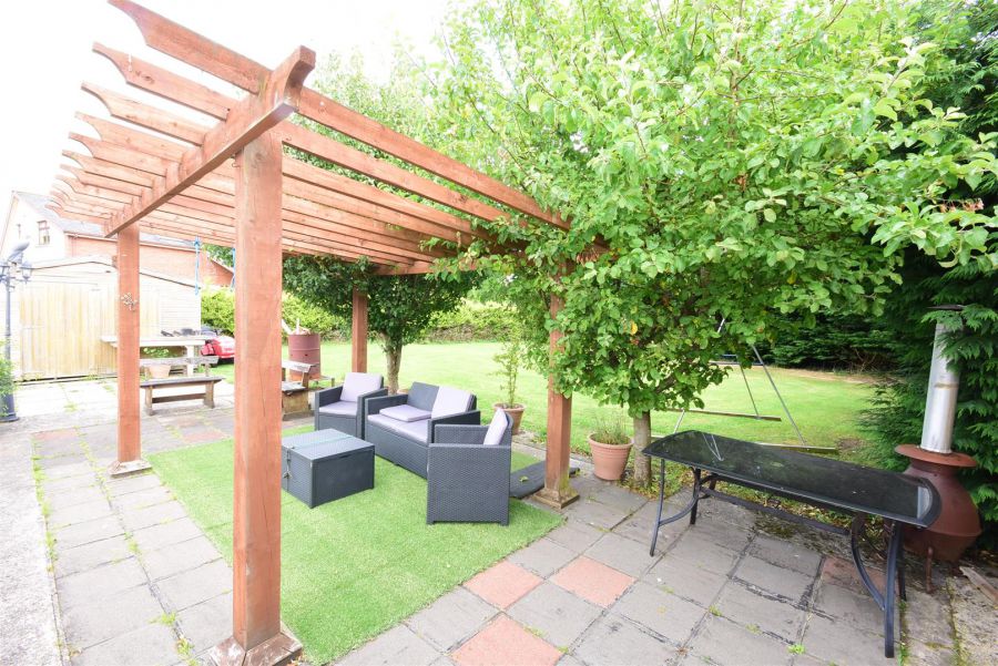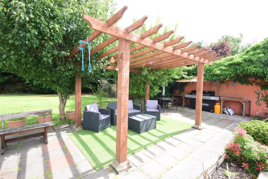 Raised patio area with paved patio and wooden pergola. Semi covered BBQ area. Open to extensive gardens at rear in neat lawn and mature conifers. PVC oil tank.